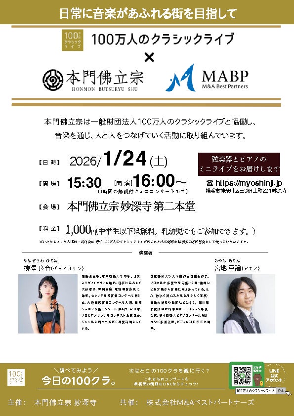 製造、建設、不動産、医療・ヘルスケア、物流、ITに特化したM&A仲介を⾏う株式会社M&Aベストパートナーズ(本社:東京都千代田区、代表取締役社長:齋藤 達雄 以下M&Aベストパートナーズ)と、一般財団法人100万人のクラシックライブ(東京都千代田区、代表理事:蓑田秀策 以下100万人のクラシックライブ)は、1月24日(土)16:00より、本門佛立宗 妙深寺にて、クラシックライブを開催することをお知らせいたします。