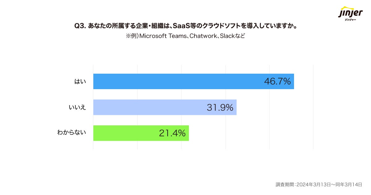 「SaaS等のクラウドシステムの導入有無」について、「はい(46.7%)」、「いいえ(31.9%)」となり、約50%の企業でクラウドシステムを導入しているという結果になりました。