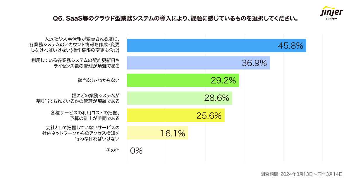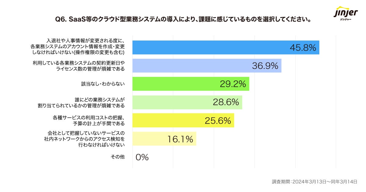 クラウドシステムを導入している企業を対象に、「導入により生じた課題」について質問したところ、上から「入退社や人事情報が変更される度に、各業務システムのアカウント情報を作成・変更しなければならない(45.8%)」、「利用している各業務システムの契約更新日やライセンス数の管理が煩雑である(36.9%)」、「誰にどの業務システムが割り当てられているのかの管理が煩雑である(28.6%)」という結果になりました。