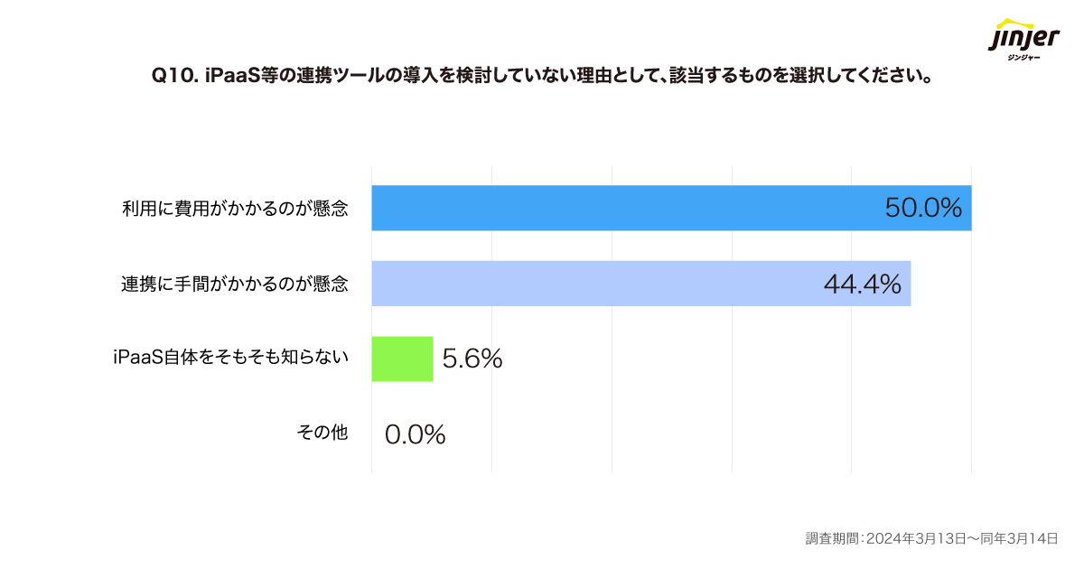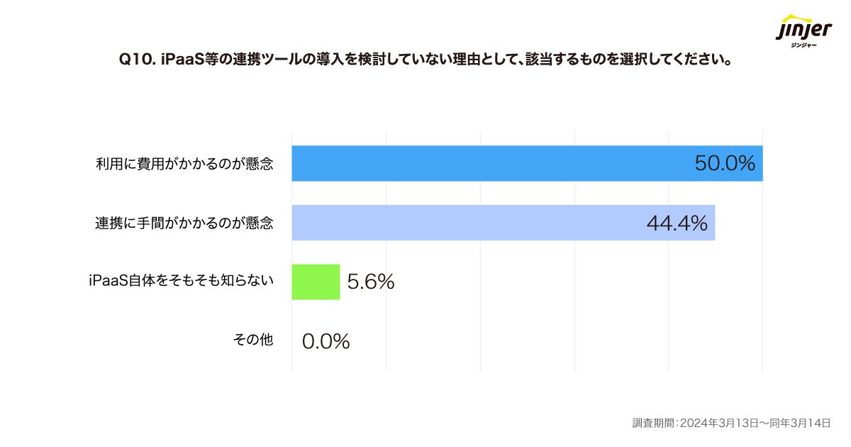 iPaaS等の連携ツールを検討しない企業の約50%が、利用コストがネックとなり、検討していないという結果に。