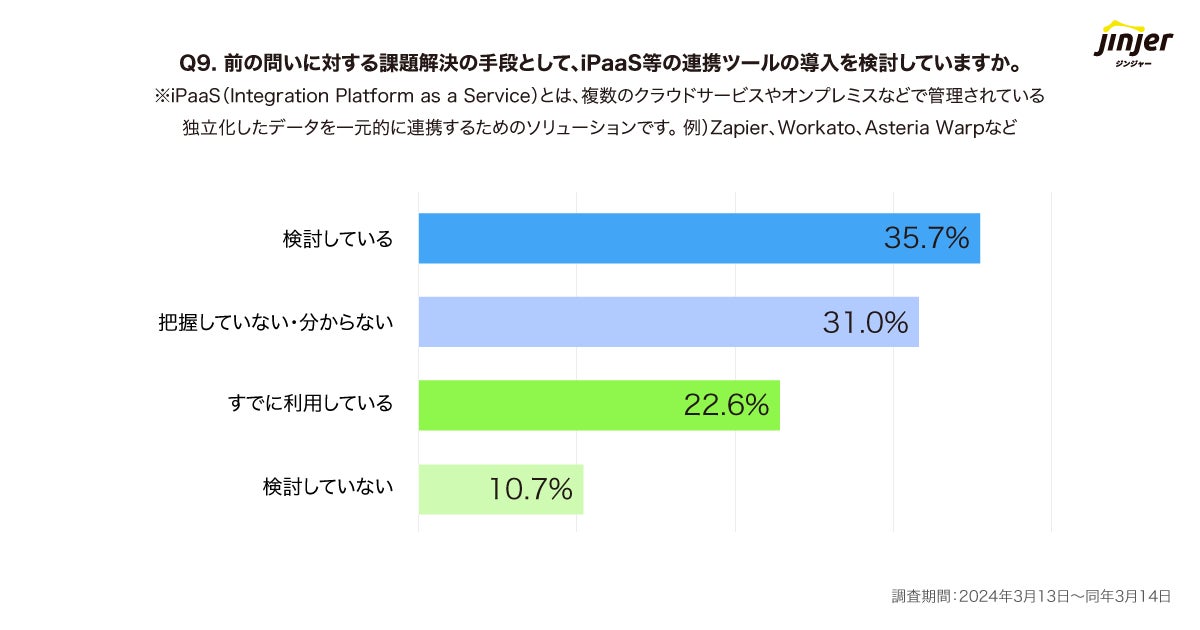 「複数システムの導入により生じた課題の解決に向けて、iPaaS等の連携を検討しているか」について、質問したところ、35.7%の企業が「検討している」と回答したものの、「すでに利用している」と回答した企業は22.6%となり、iPaaS導入が進んでいない状況が明らかになりました。