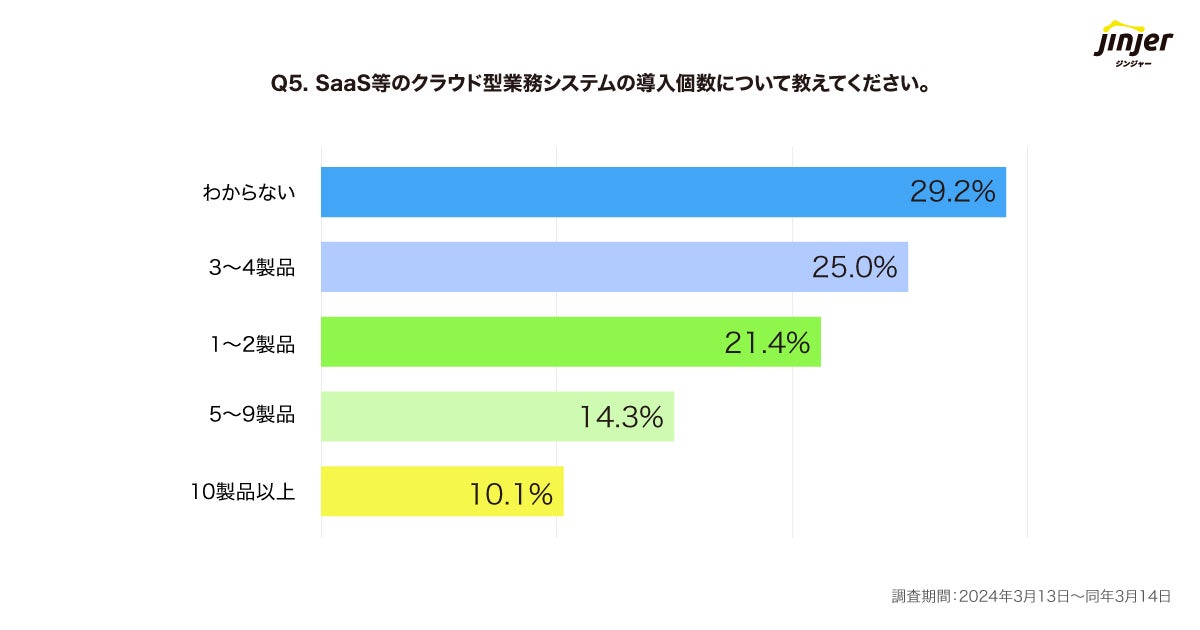 クラウドシステムを導入している企業を対象に、「クラウドシステムの導入個数」について質問したところ、「3~4製品(25.0%)」、「5~9製品(14.3%)」、「10製品(10.1%)」となり、約50%の企業がクラウドシステムを3製品以上導入しているという結果になりました。