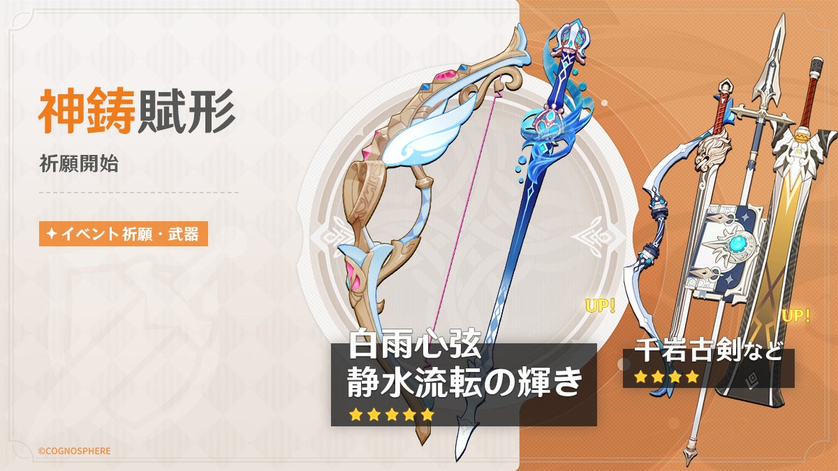 期間中、新★5武器「弓・白雨心弦」、限定★5武器「片手剣・静水流転の輝き」などの出現率が大幅にUPします。