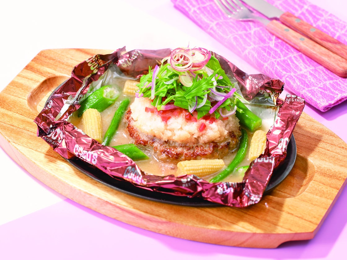 ココス定番の包み焼きハンバーグをたっぷりの香味野菜と梅の酸味で爽やかに仕上げました。