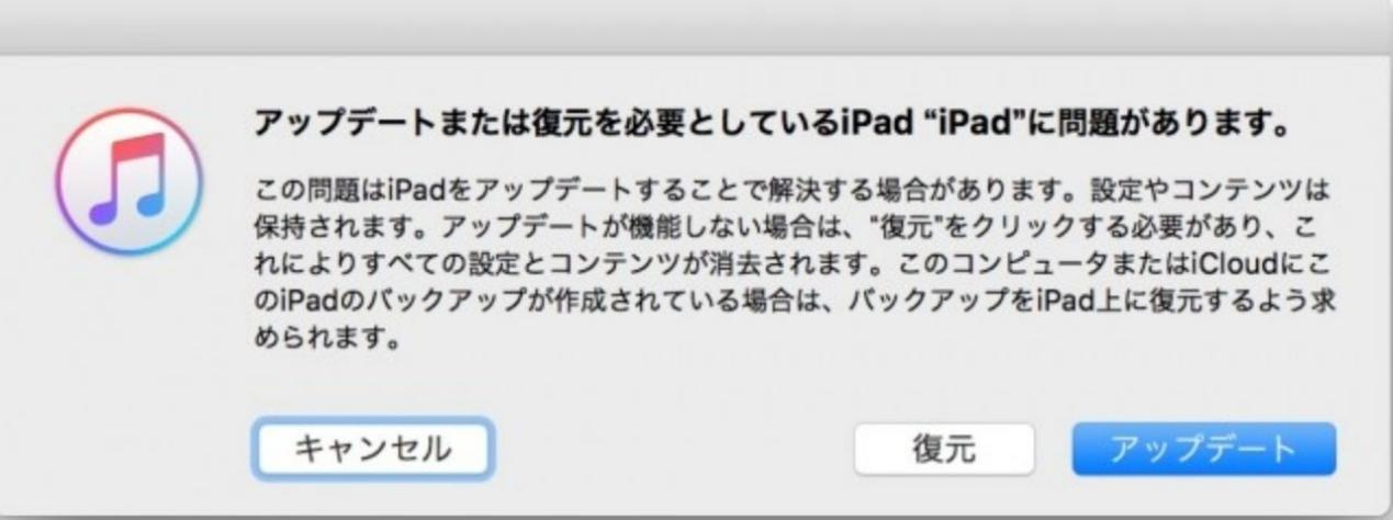 Step3:iPhone/iPadのリカバリーモードが起動するとiTunesにメッセージが表示されます。「復元」を選択してiPadの初期化を開始します。
