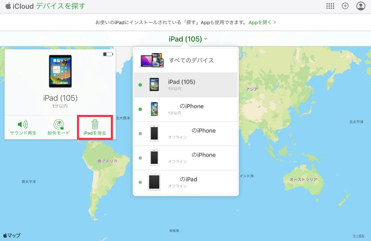Step2:「探す」を選択し、「すべてのデバイス」から初期化するデバイスを選びます。