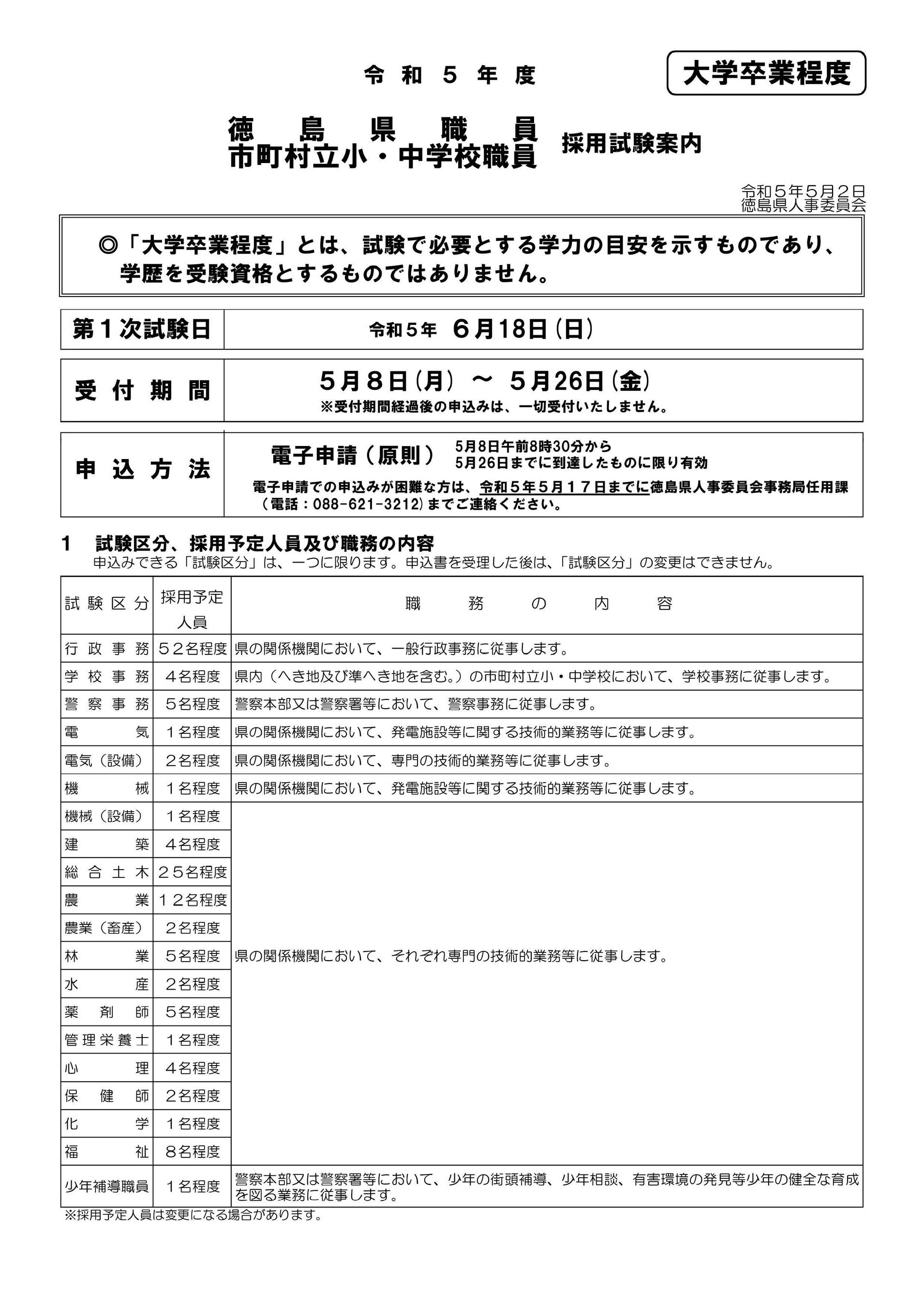 徳島県職員等(大学卒業程度):5月8日から5月26日