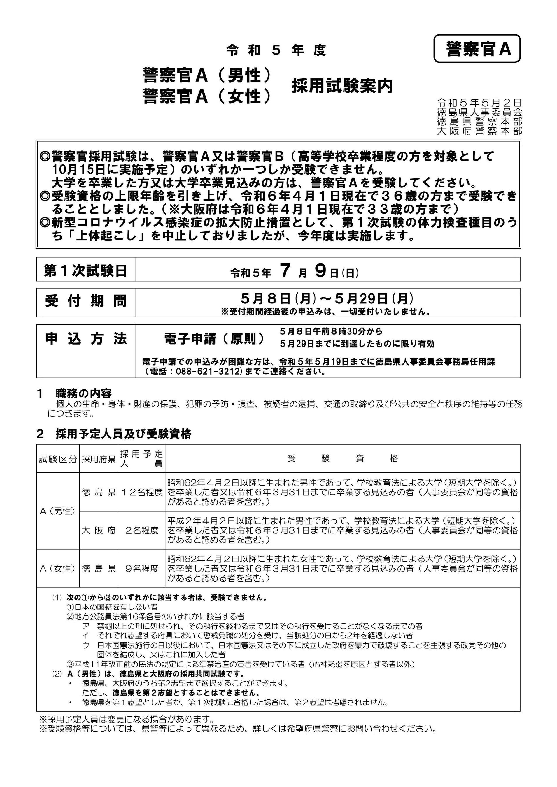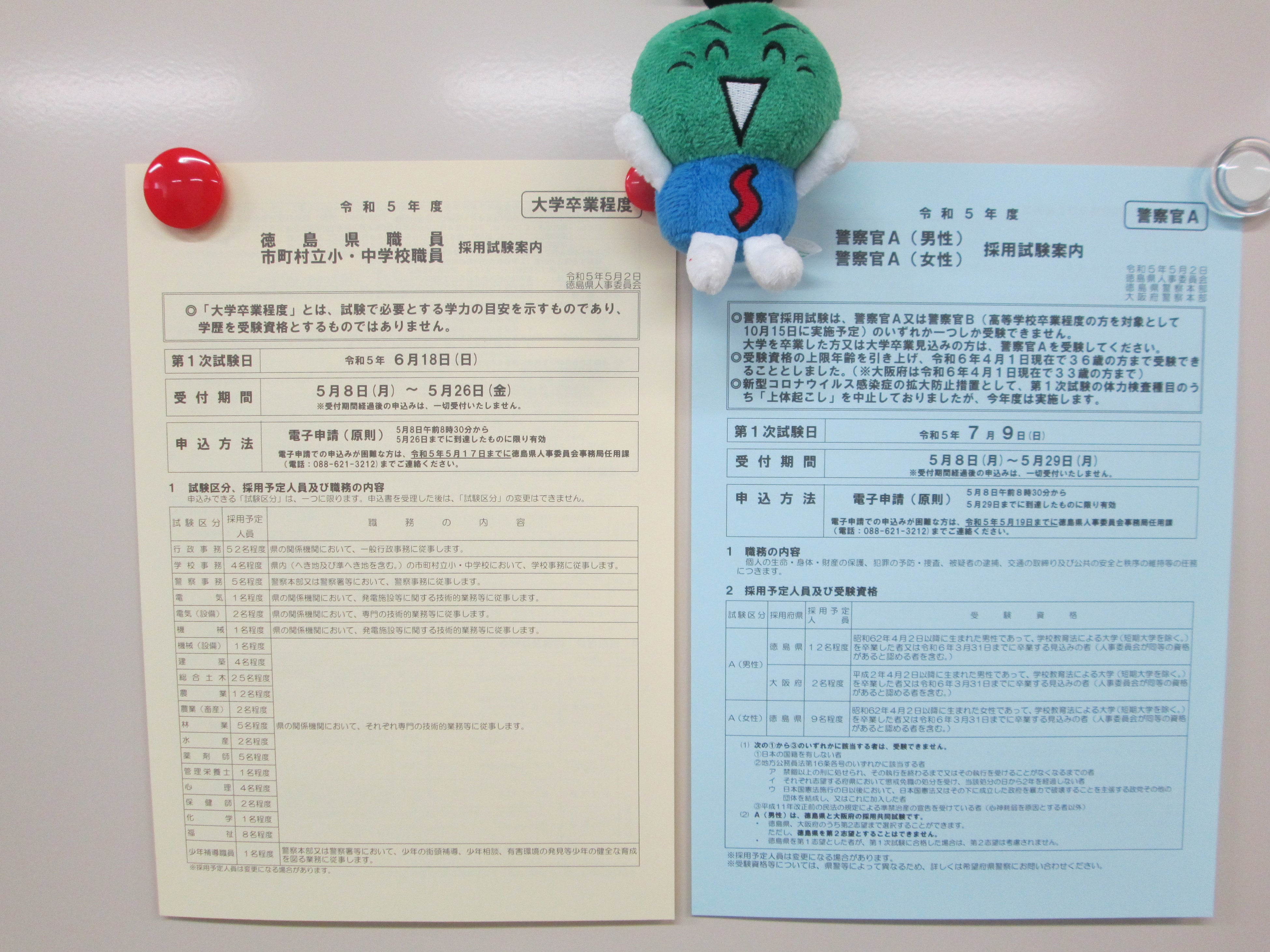 徳島県職員等採用試験(大学卒業程度)、警察官A採用試験の受験申込みを開始しました。