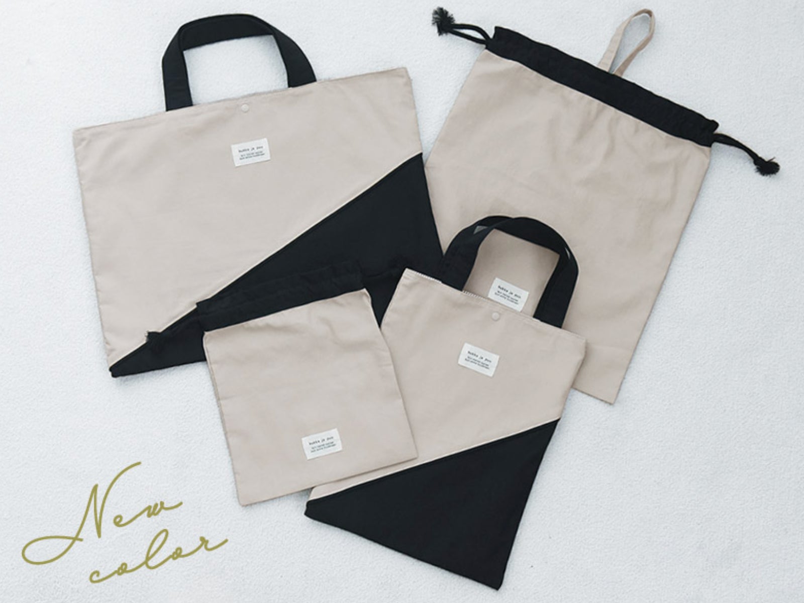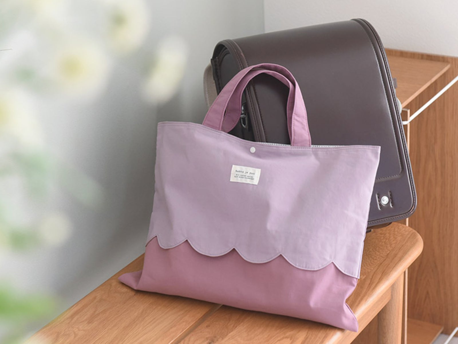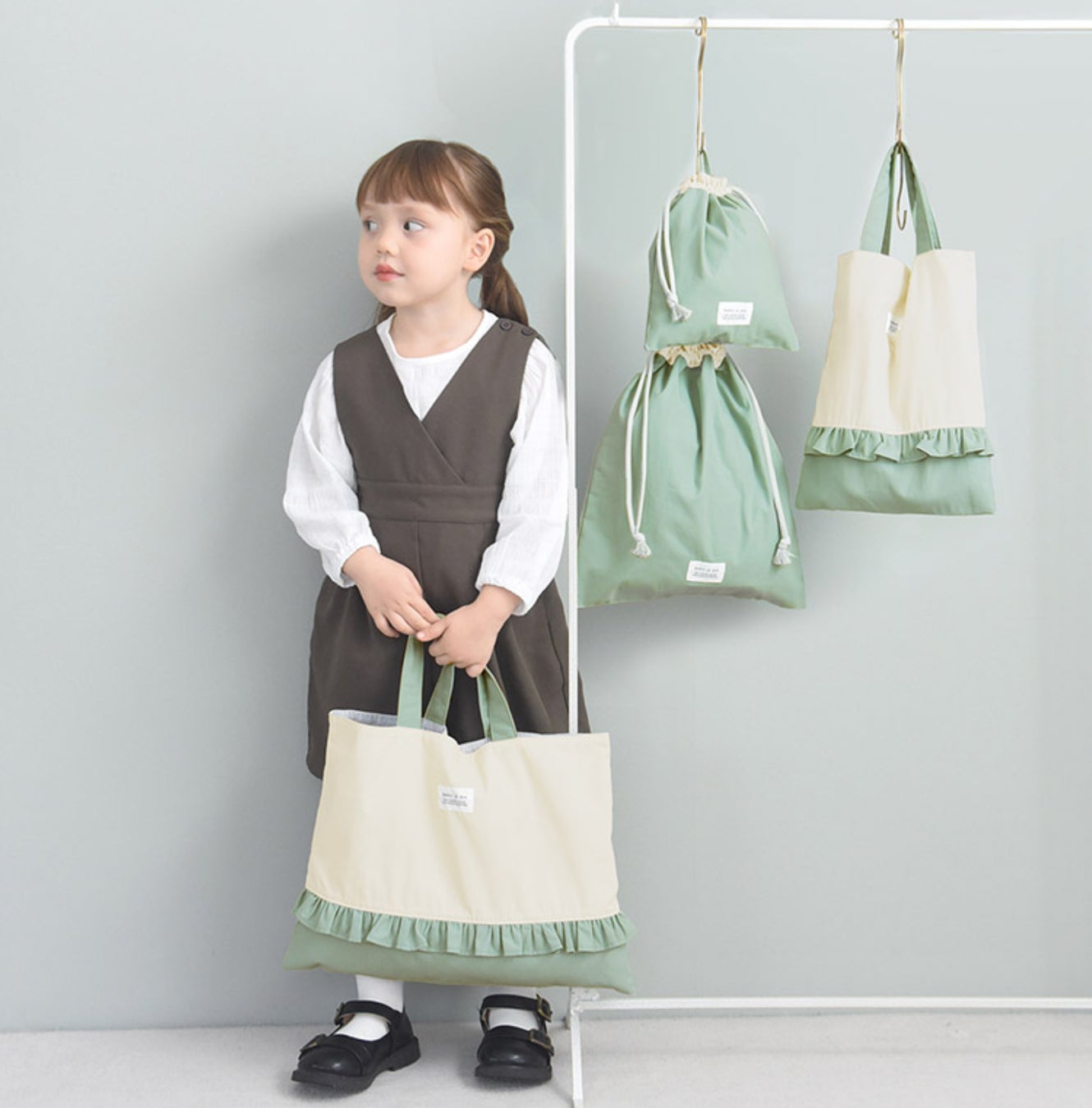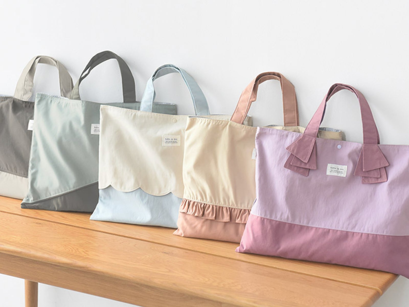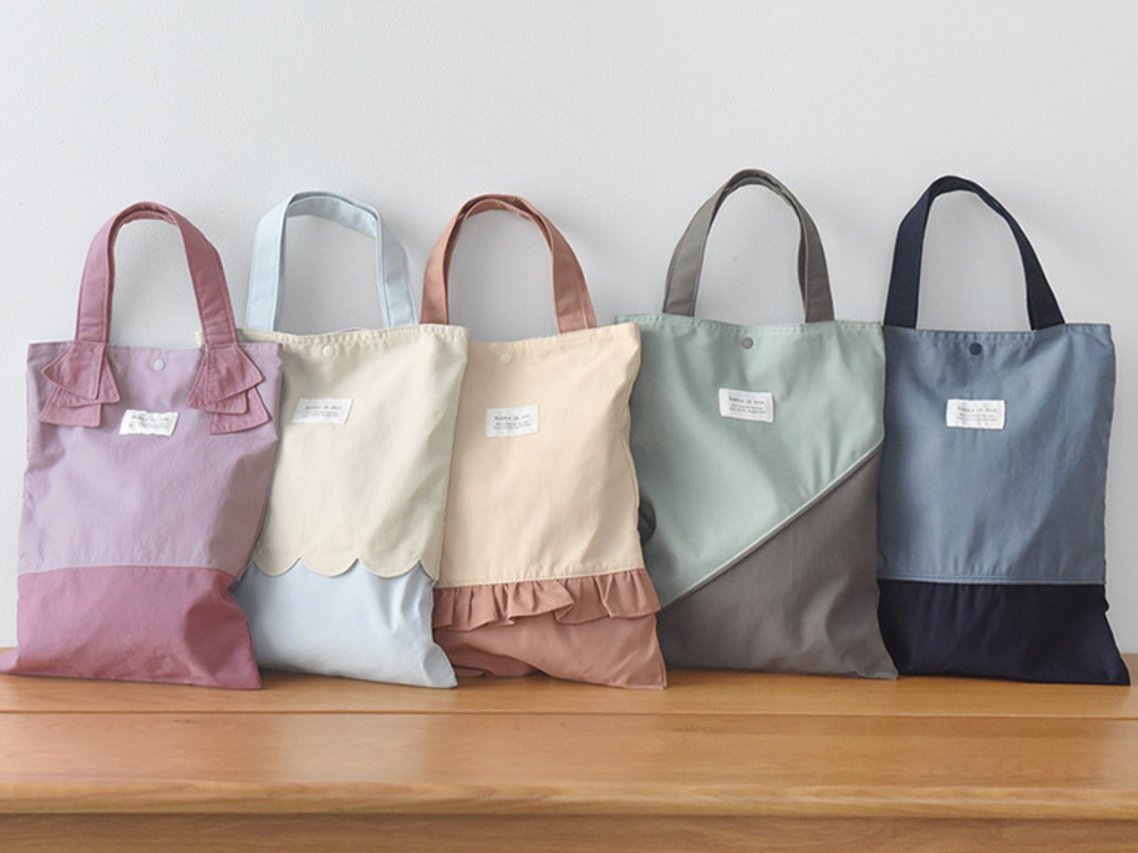 落ち着いた北欧カラーの生地を使い、フリル、スカラップ、すっきりシンプル無地など全10種類のデザインで仕上げた「レッスンバッグ」。