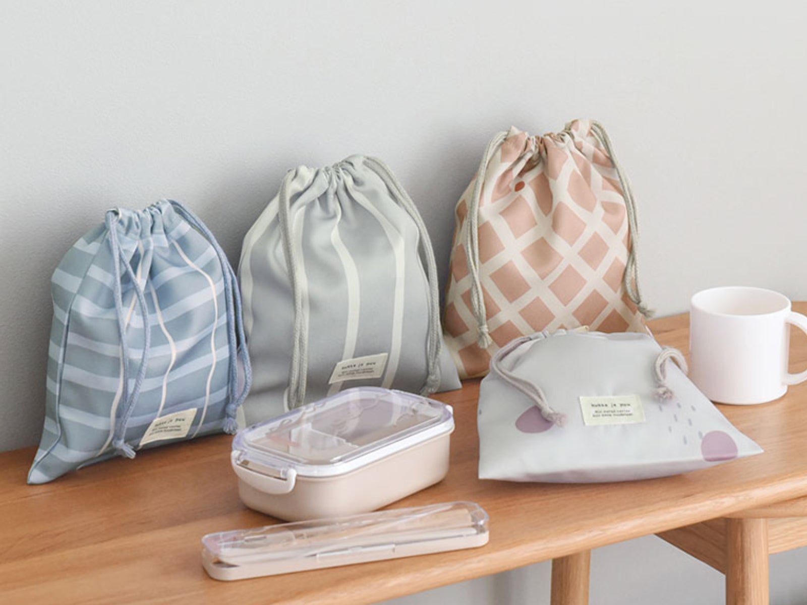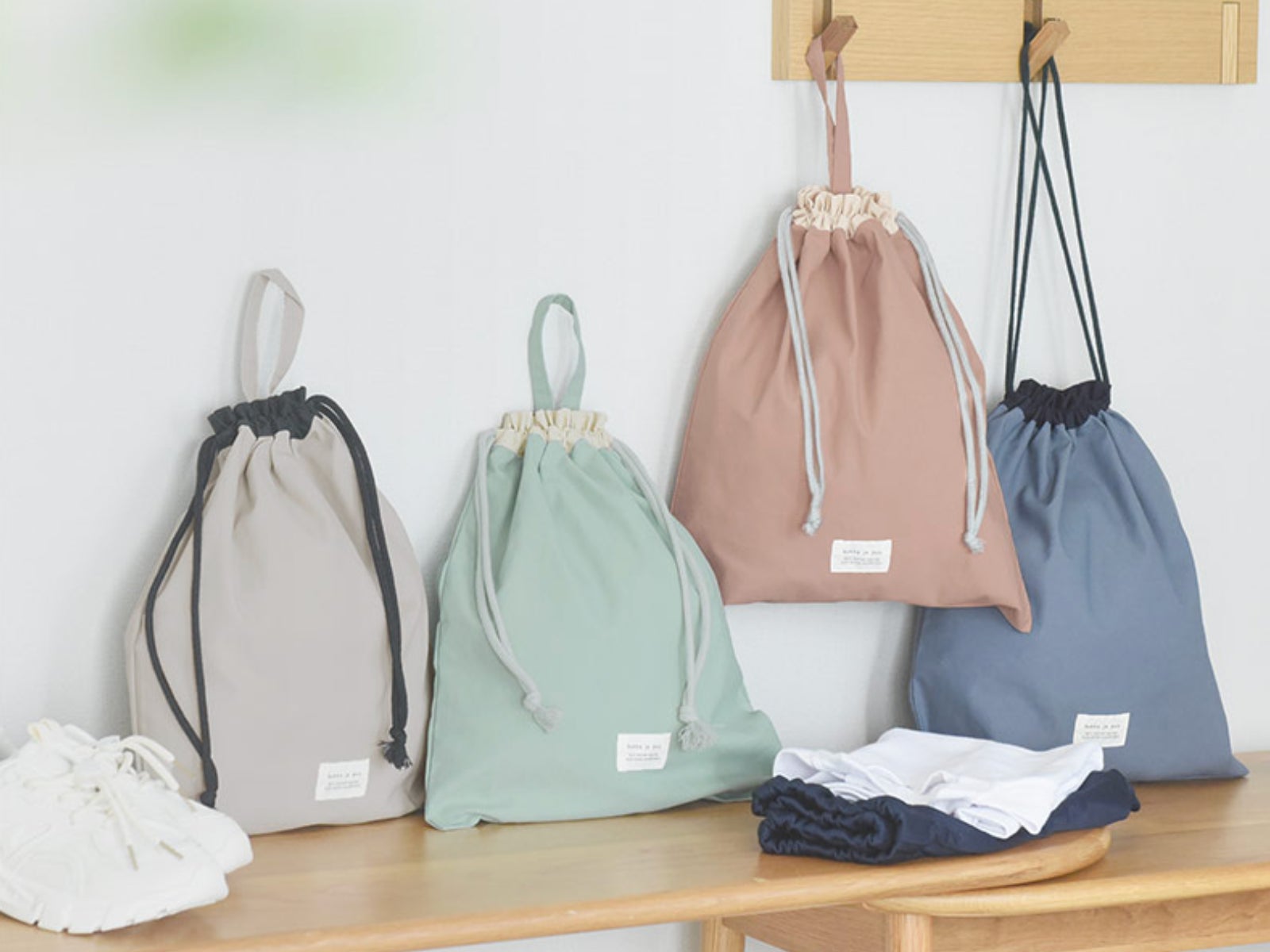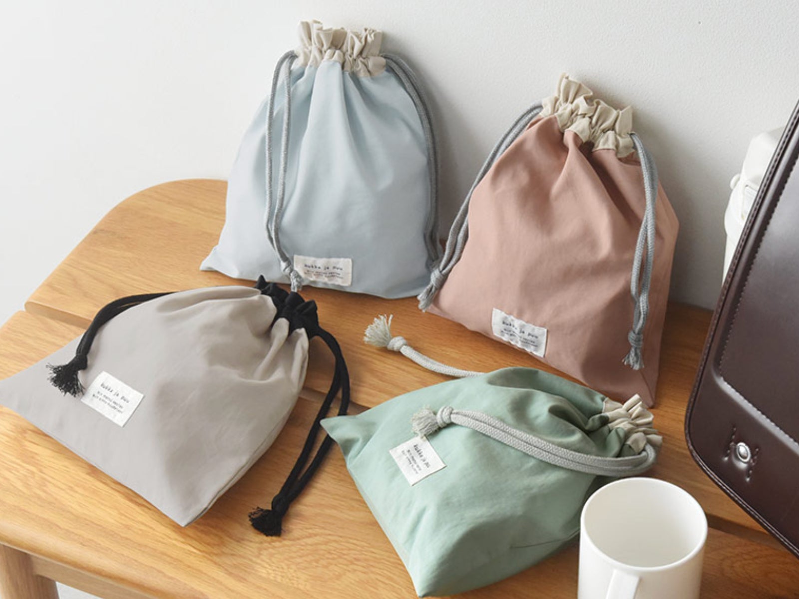 ランチョンマットやコップを入れるのにちょうどいい「巾着袋(小)」。シンプルデザインだから、入園・入学から高学年まで幅広くお使いいただけます。