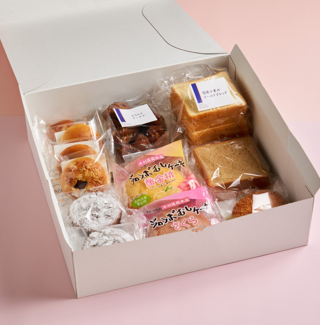 菓子パン:3種のチョコマフィン×2、木村屋カレーパン、かりんとドーナツ10入