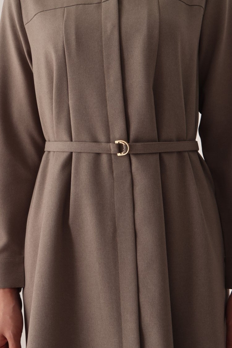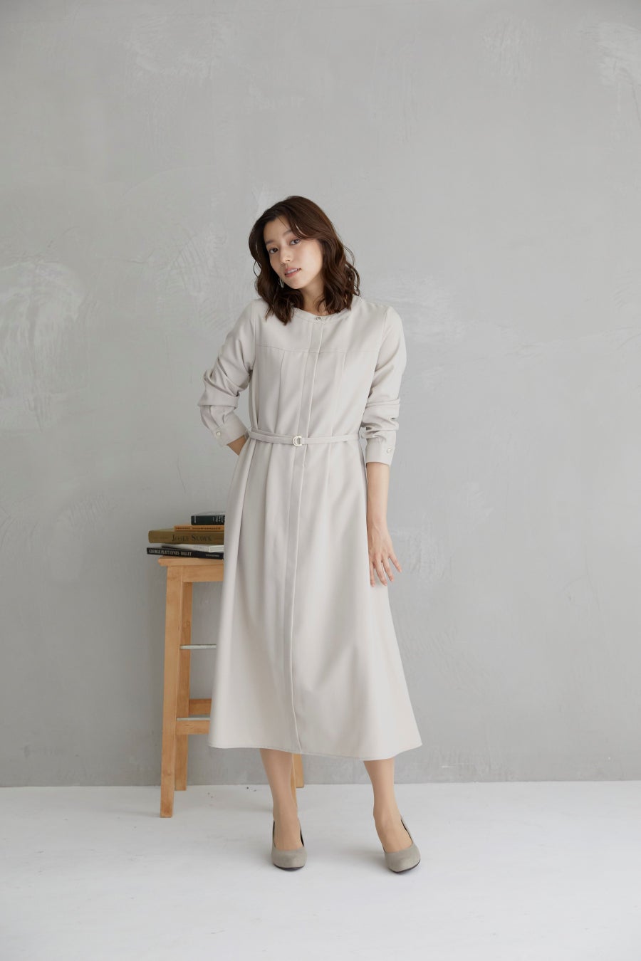 ウエストマークができるベルト付きフレアワンピース。ベルトは取り外し可能で2通りの着こなしが楽しめます。首元と袖口にはアクセントとなるゴールドボタンを採用し上品な印象に。1枚着ではもちろん、タートルネックニットやパンツのとのレイヤードなど様々な着こなしが可能です。