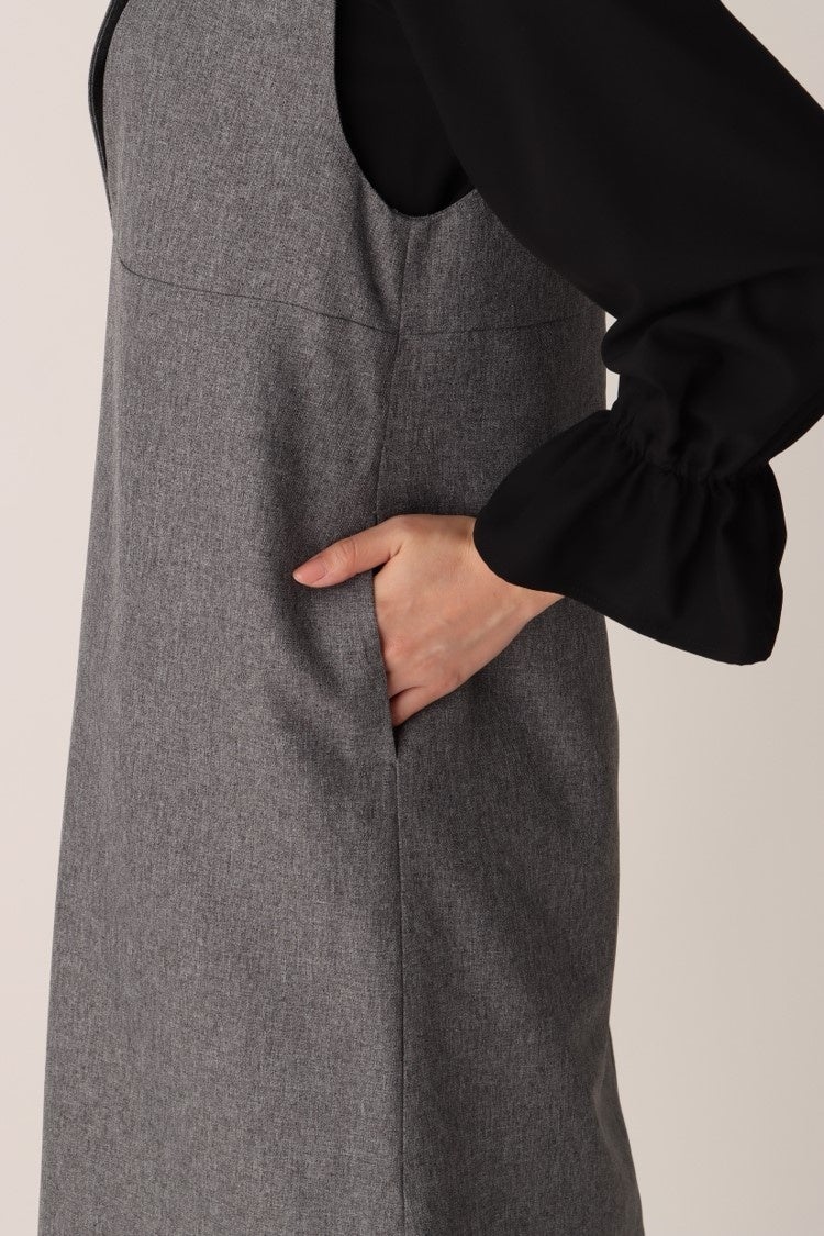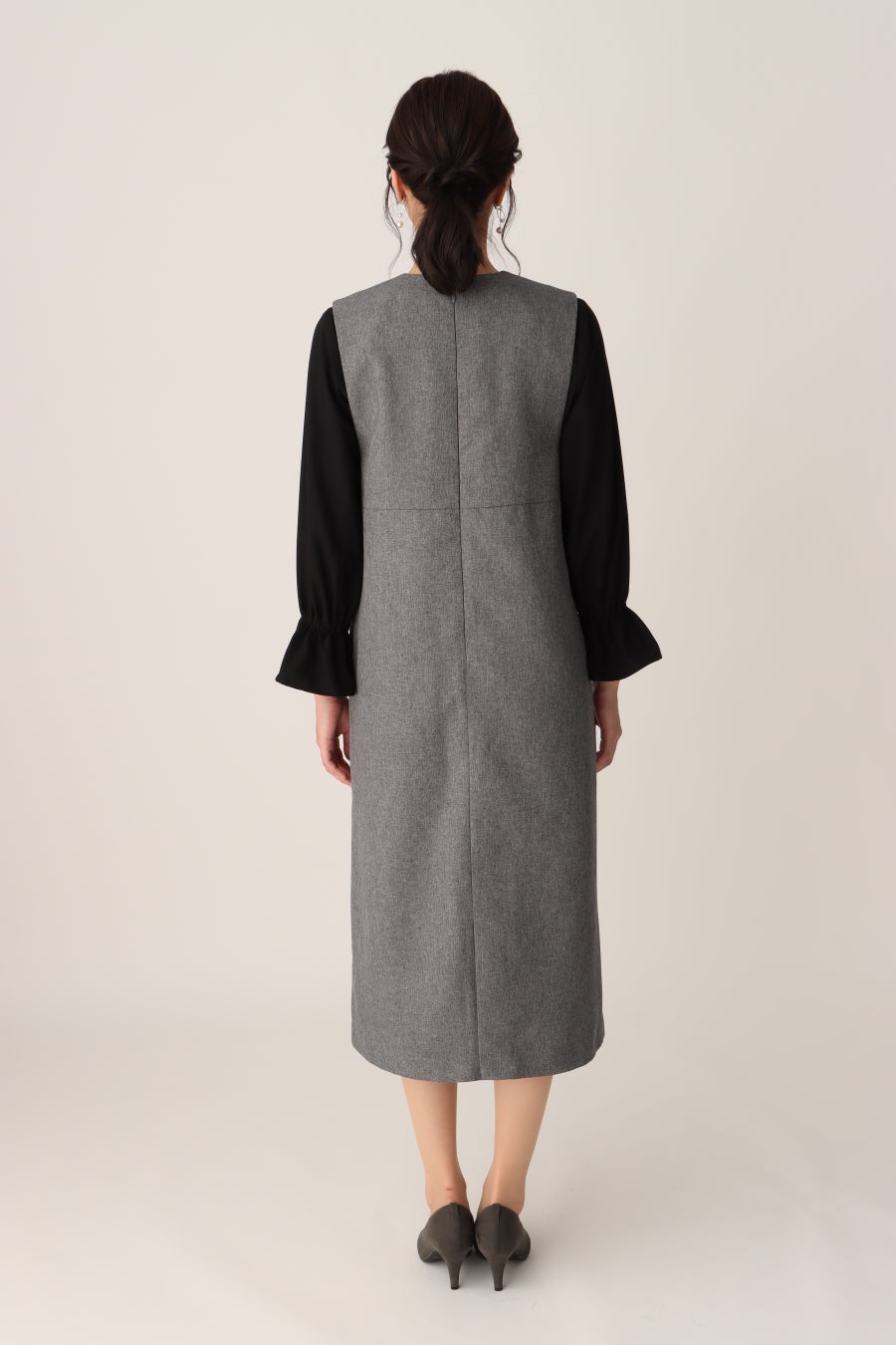 ボディラインを拾いすぎずストレートのシルエットでスッキリ見えするジャンパースカート。胸元は深めのVネックデザインにすることでボウタイやギャザーなどボリューム感のあるトップスとも相性抜群。ビジネスシーンでも便利な小物を収納できるポケット付きのほか、自宅で洗えるウォッシャブル仕様です。