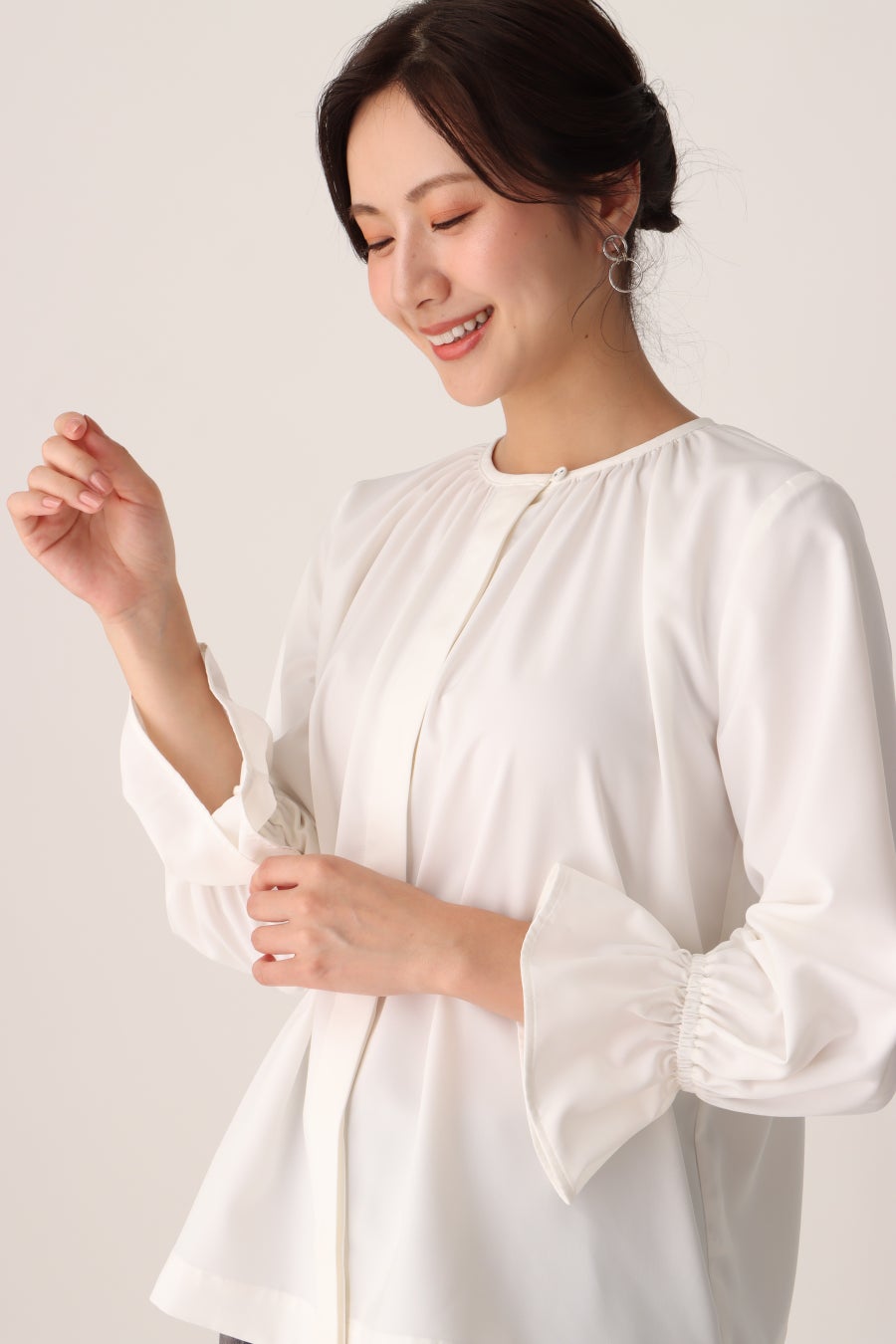 ボリューム感のあるフレア袖と、細かい胸元のギャザーがポイントのフレアスリーブブラウス。シンプルながらもほどよい大人の甘さと華やかさがあり1枚でも存在感のあるデザインです。