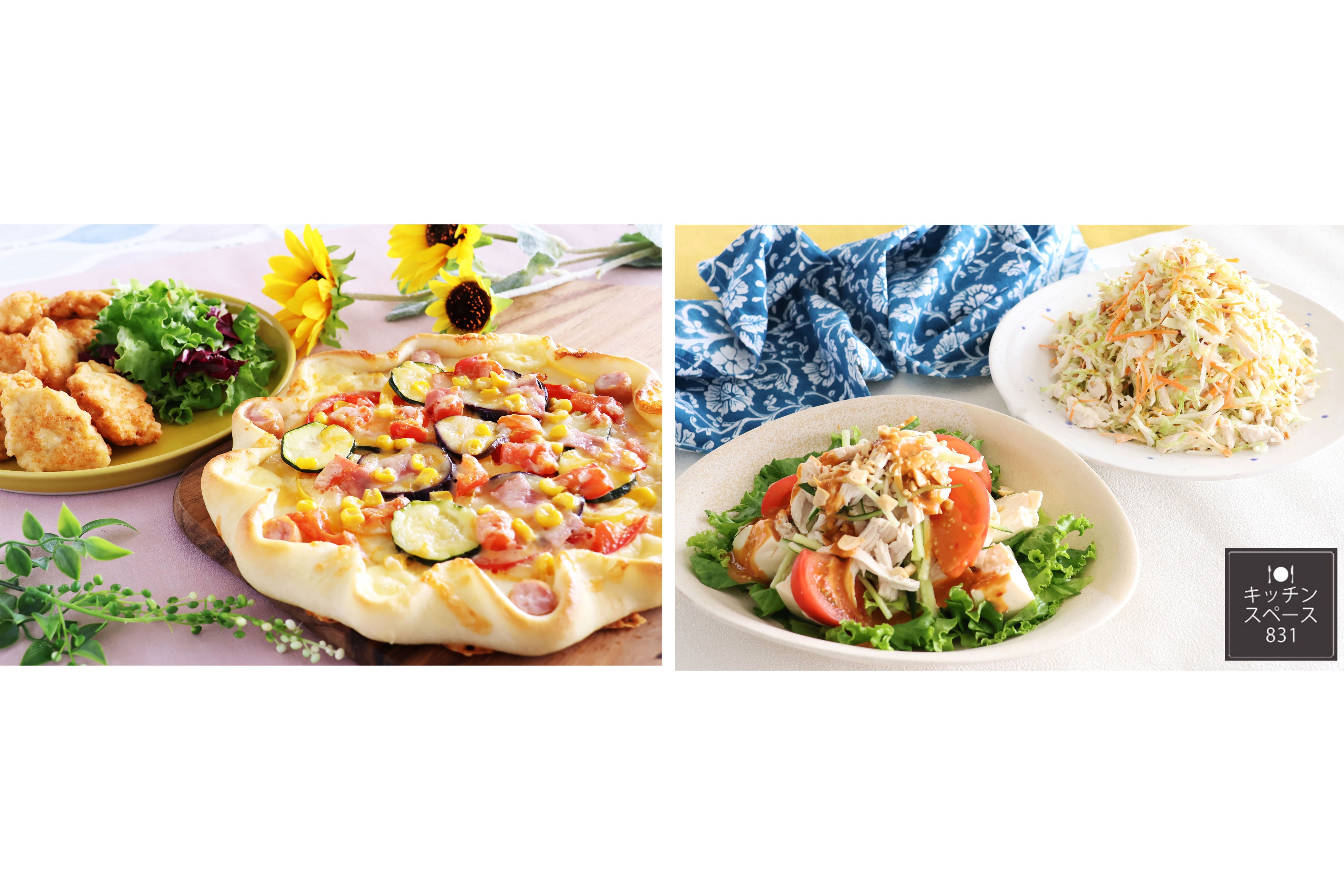 今回は、2つのレッスンをご用意。対面では「おうちで楽しむ!手作りピザ&チキンナゲットレッスン」、オンラインでは「デパ地下人気サラダ しっとり蒸し鶏で作る夏サラダ2種!」を開催します。