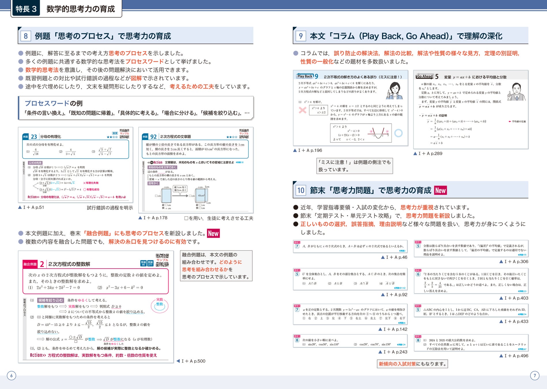 節末の【定期テスト・単元テスト攻略】で,テスト直前に内容の確認ができます。また,数学的思考力を身に付ける【思考力問題】を新設しました。