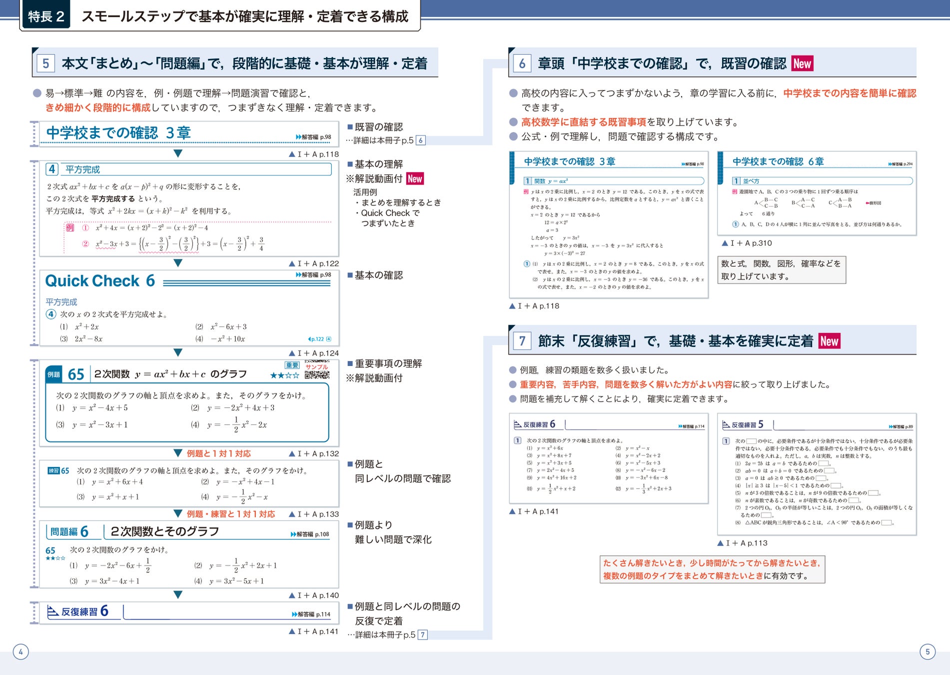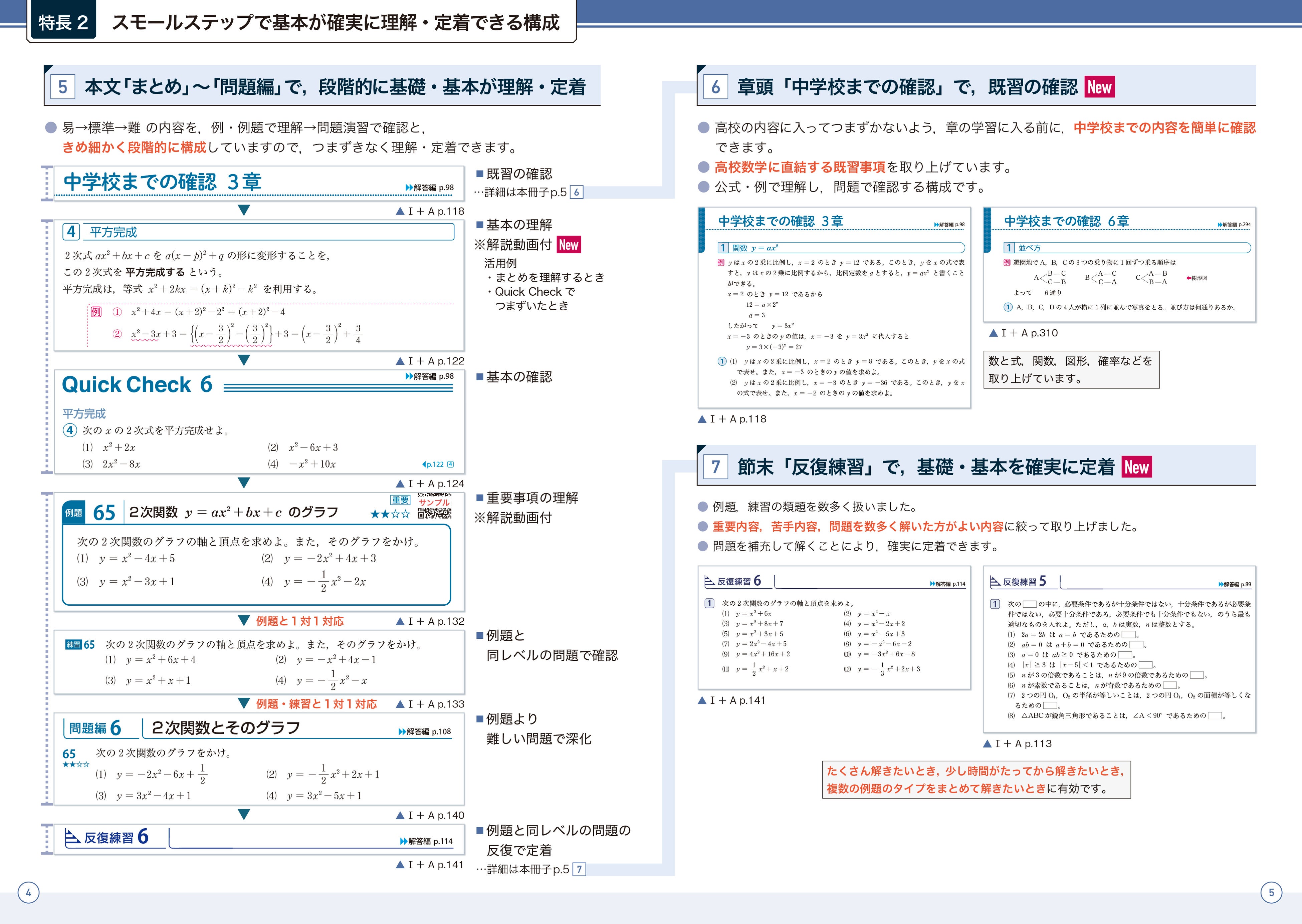 節末「反復練習」では,数式,関数,図形など全範囲における,重要・苦手内容の,例題,練習の類題を数多く取り上げました。