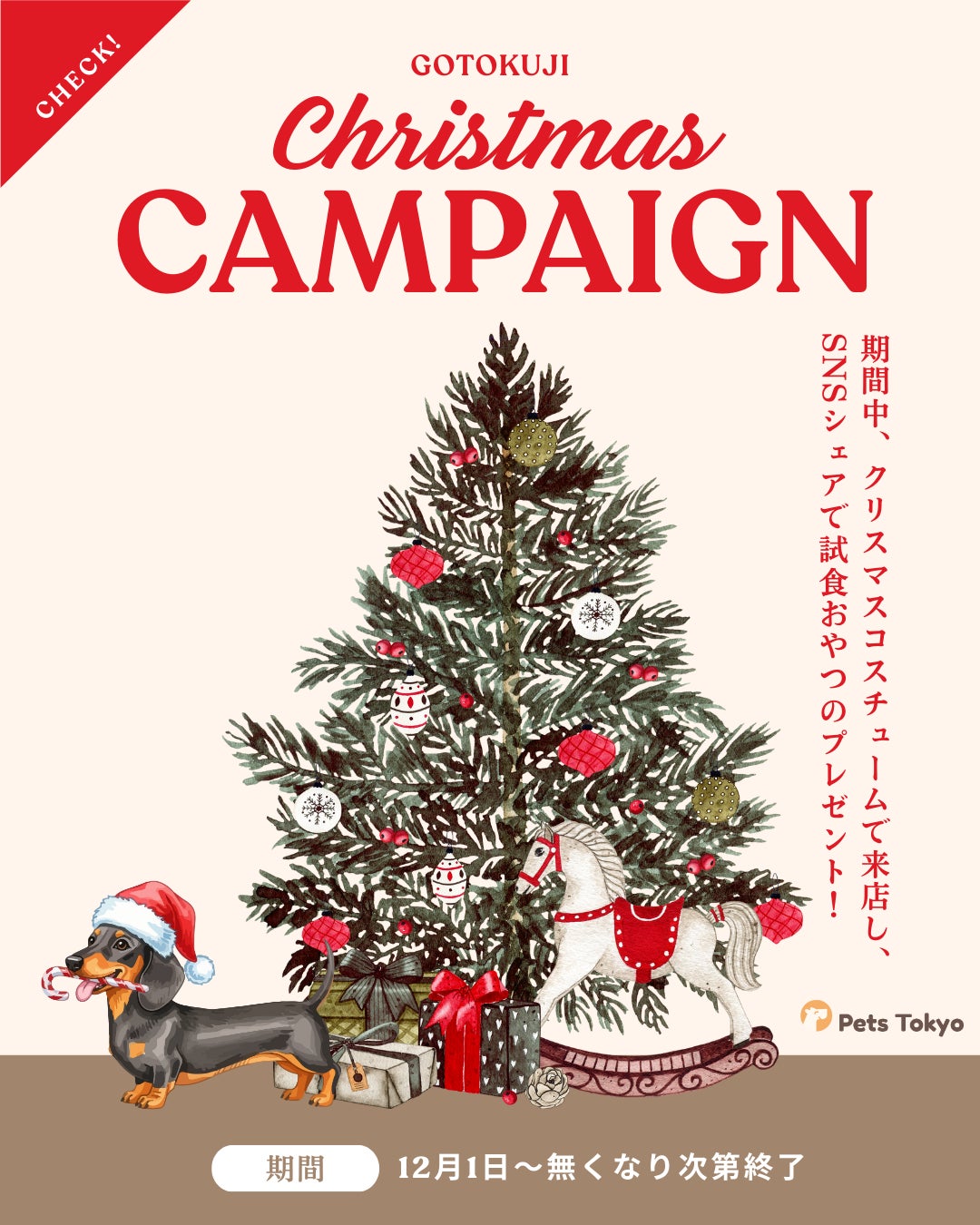 Pets Tokyo豪徳寺店では12月1日〜(無くなり次第終了)日頃のご愛顧に感謝を込めて、「クリスマスおやつプレゼント」を開催いたします。