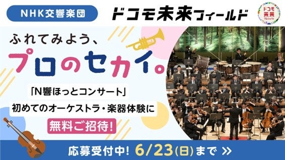 2024年7月に開催する「docomo business ROOKIE企画」「DOCOMO TEAM DANDELION RACING企画」「NHK交響楽団企画」の3つのイベントを対象に、お子さまと保護者をペアでご招待いたします。