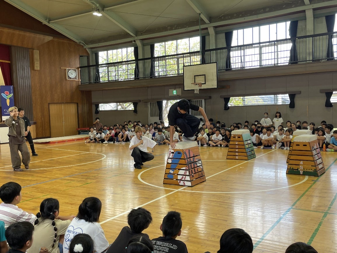 講演では、パルクールのトップ選手が「パルクールの楽しさ」や「パルクールを通した自分らしい生き方」を児童に伝え、また、デモンストレーションでは、アクロバットな演技に児童のみならず、教職員も大興奮!次世代のアーバンスポーツ“パルクール”の魅力と本質を余すことなく伝えました。