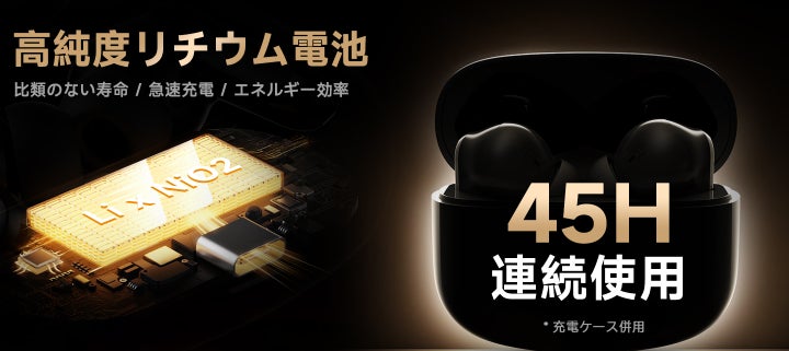 1回の充電で最大5.5時間の連続再生、ケースと併用すれば最大45時間。通勤や旅行などの長時間使用にも対応。さらに、ケースにバッテリー残量表示を搭載しており、充電タイミングが一目でわかります。Type-C急速充電対応で、忙しい日常でも快適に使用可能です。