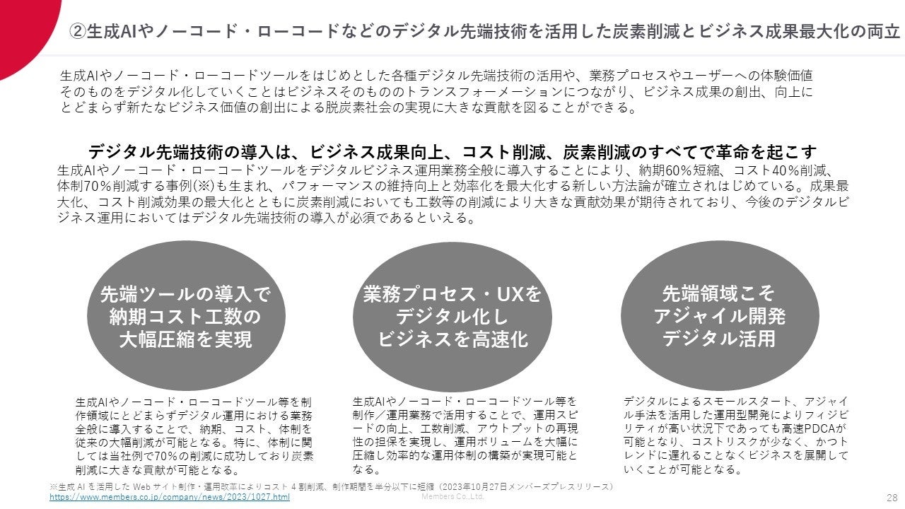 ・②生成AIやノーコード・ローコードなどのデジタル先端技術を活用した炭素削減とビジネス成果最大化の両立