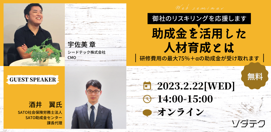 今回はより多くの企業にサービスをご活用いただければと、助成金申請に実績のある業界最大規模のSATO社会保険労務士法人とともに、「助成金を活用した人材育成とは」を開催することとなりました。セミナーでは、人材開発支援助成金「事業展開等リスキリング支援コース」の概要や申請手続きについて、また、法人向けSaaS型DX/IT人材育成サービス「ソダテク」について解説し、「ローコスト・ハイリターンのリスキリング」を実現できるスキームをお伝えいたします。