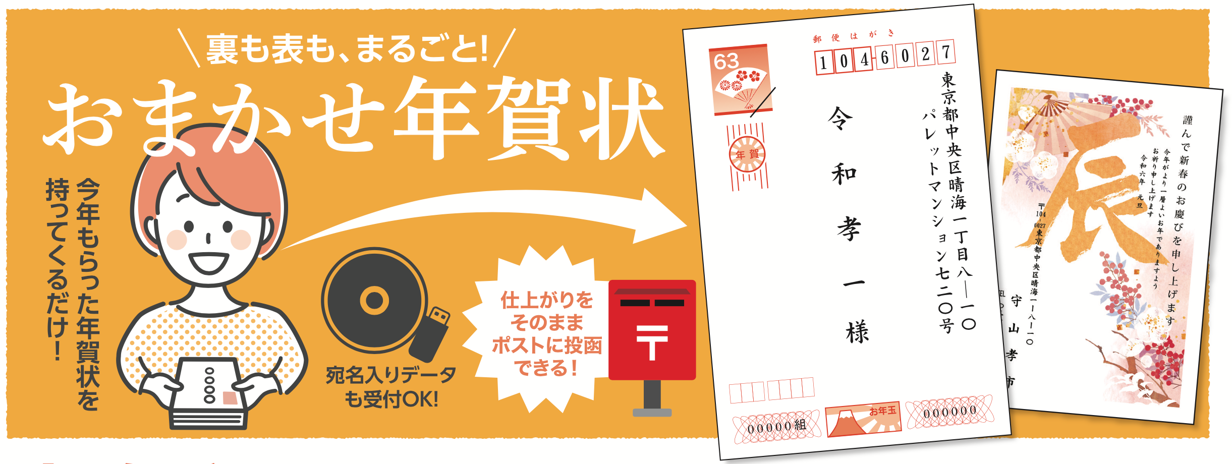 年賀状にまつわるそのお悩みを、パレットプラザが解消します。年賀状印刷も宛名印刷も、今年はまるごとパレットプラザ年賀状におまかせください!
