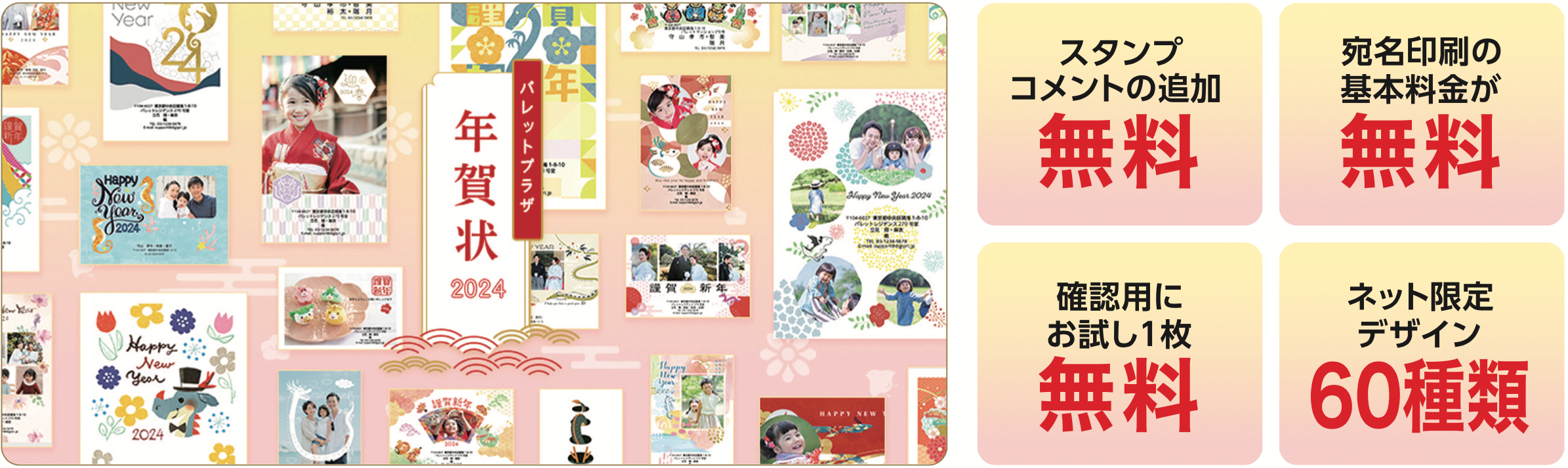 という方には、パレットプラザ年賀状サイト・スマホアプリからのご注文がおすすめ!スタンプ無料・宛名印刷基本料金無料・お試し一枚無料と、ネット注文ならではのお得が満載です。