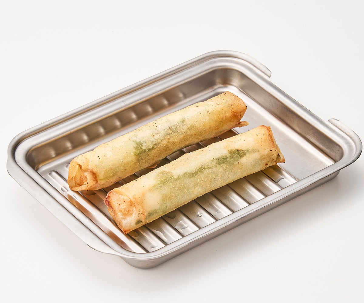 波型の蓋バットは、下ごしらえや油切りに使えて調理がスムーズに。フライバスケットは、唐揚げやフライドポテトなどの小さな揚げ物もまとめて一気に引き上げることができて、二度揚げにも便利!鍋の縁にかけられるフックが付いているので、油切りにもお使いいただけます。