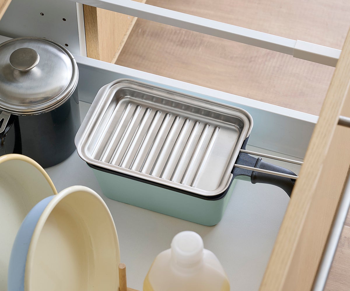 幅が広めのスクエア形状により、コンパクトながら少ない油でもしっかり揚げられるので、揚げ物料理がより気軽に楽しめます。また、スクエア形状は、エビフライなどの長い食材も揚げやすく、トンカツもゆったり揚げられます。使用後の油も鍋の角から注ぎやすく、後片付けにも便利です。また、付属品を本体にセットすれば、場所もとらずスマートに収納できます。
