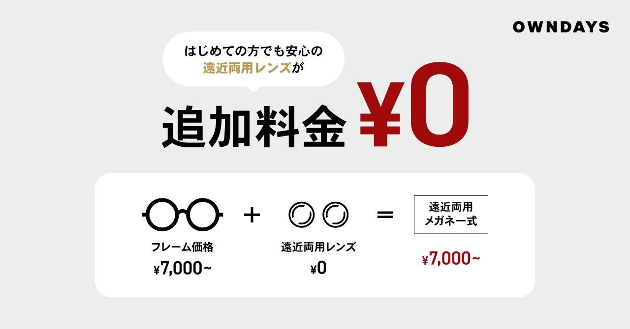 OWNDAYSでは、フレームを問わず遠近両用レンズの追加料金を0円※で提供しているため、遠近両用メガネ一式を7,000円からお求めいただくことが可能です。初めての方にもファッション感覚でお選びいただける豊富なフレームに加え、専門スタッフによる無料の視力測定も承っています。お近くの店舗にぜひ、足を運んでみてください。