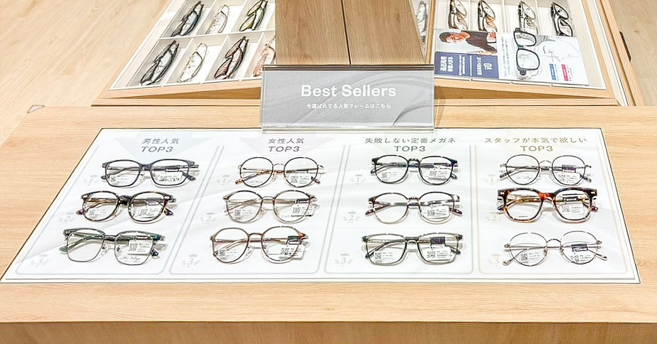 新店舗はLINKS UMEDAの7階に位置し、ニトリやスーツ専門店などが集積するフロアで、お買い物の合間にも立ち寄りやすい便利な立地です。お客様がスムーズに回遊できるよう導線を確保しつつ、新たにお客様のアイウェア選びをサポートするため、今選ばれているフレームがわかる「Best Sellers」や自分に合った遠近両用レンズを探す事ができる「おすすめ遠近診断チャート」などの什器を設置しています。ぜひ、ご自身に最適なメガネをお探しください。