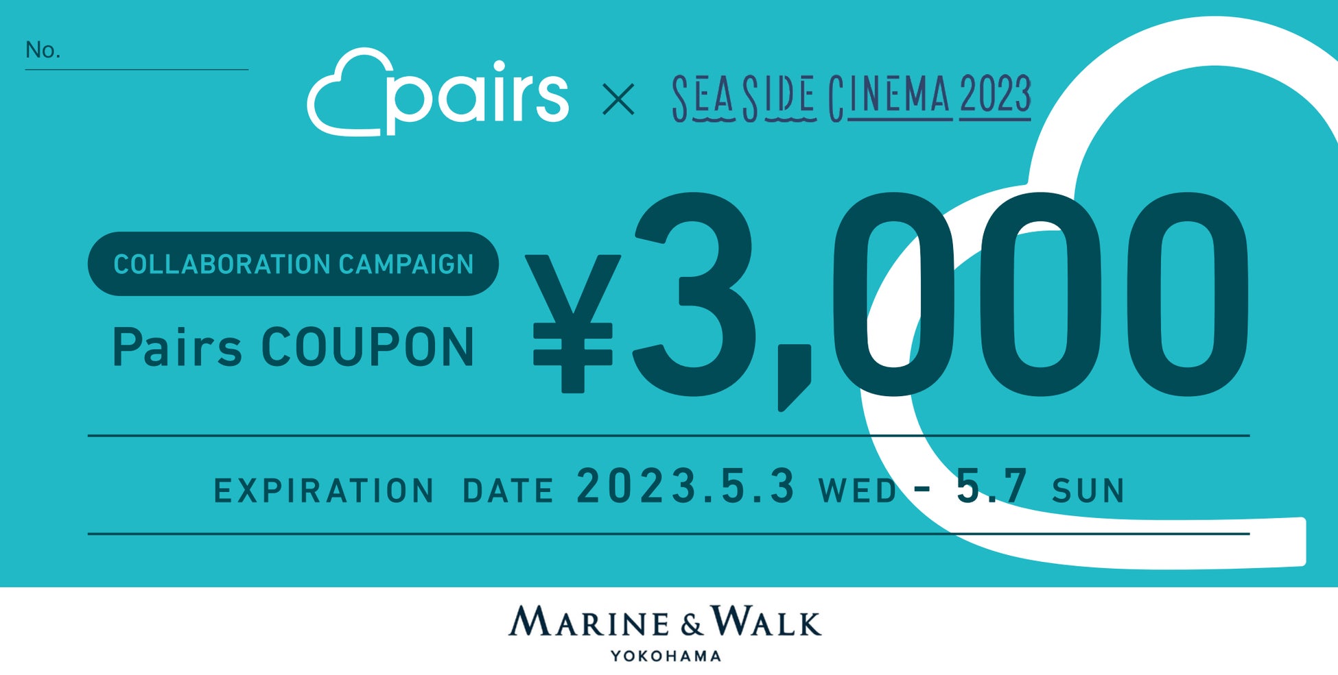 また、コラボレーションを記念し、4月27日(木)から4月30日(日)の期間中、ペアーズ公式Twitterアカウントをフォローの上、キャンペーンツイートに対して「ペアーズで映画デート」をつけて返信いただいた方の中から抽選で50組100名様に、『SEASIDE CINEMA 2023』会場の1つである「MARINE&WALK YOKOHAMA」飲食店で使用できる3,000円分ペアクーポンをプレゼントいたします。