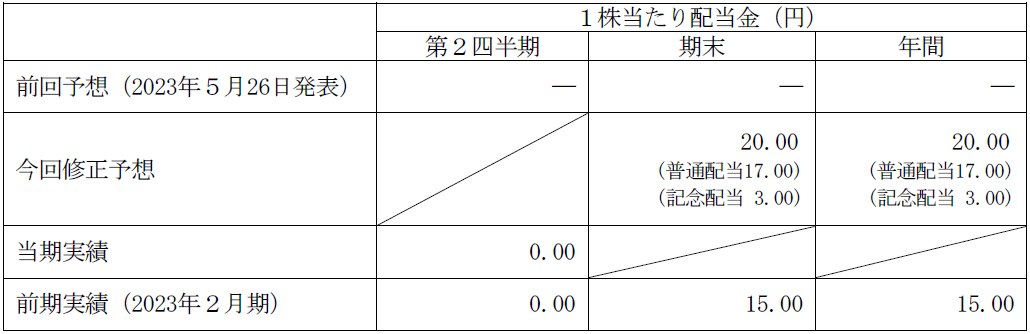 2024年2月期の期末配当予想につきましては、業績・財務状況及び事業環境等を総合的に勘案し、1株当たり17円の普通配当を予定することとしました。