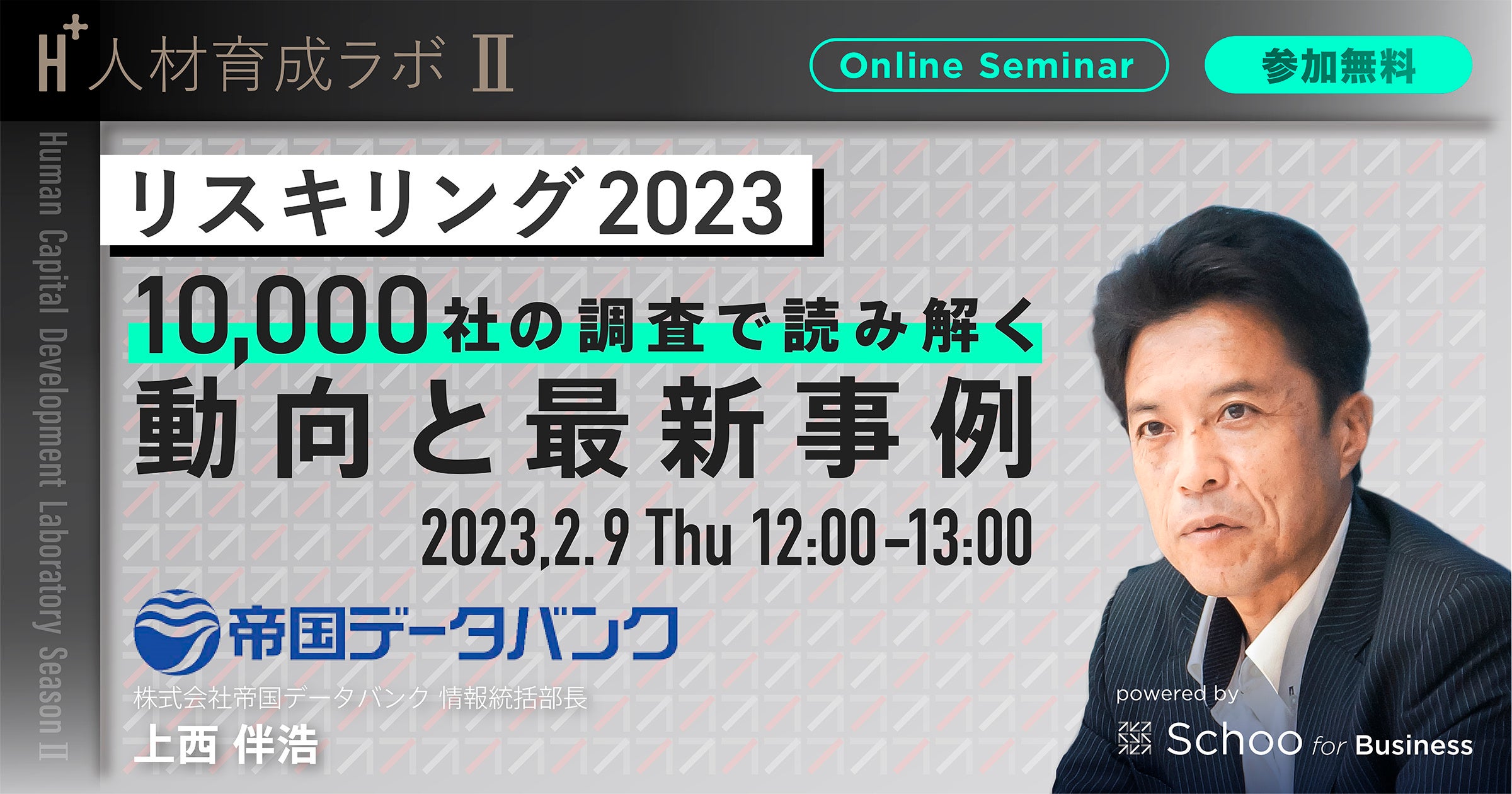 インターネットでの学びや教育を起点とした社会変革を行う株式会社Schoo(本社:東京都渋谷区、代表取締役社長CEO:森 健志郎、以下「スクー」)が提供する法人向け研修サービス「Schoo for Business」は、人的資本経営や組織開発に関連する情報発信やイベントを開催する「人材育成ラボ(H+)」を運営しています。この度2月9日(木)に、株式会社帝国データバンクの情報統括部長である上西氏をお迎えし、同社が行った各社へのヒアリングから見えてきたリスキリングの最新事例を紹介いただくウェビナーを開催します。参加費は無料です。