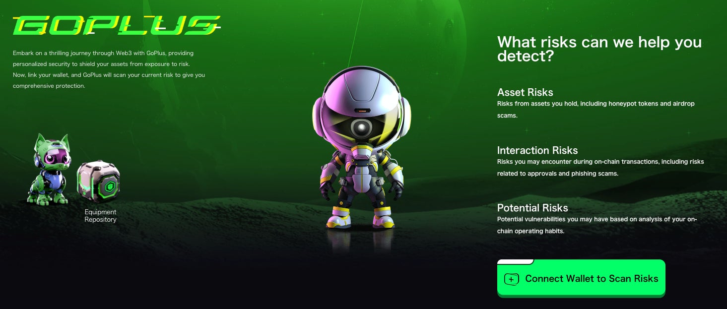 GoPlusは、Web3の世界で安全な体験を提供するため、資産をリスクから守るパーソナライズされたセキュリティソリューションを提供します。ウォレットを接続することで、GoPlusは現在のリスクをスキャンし、包括的な保護を行います。