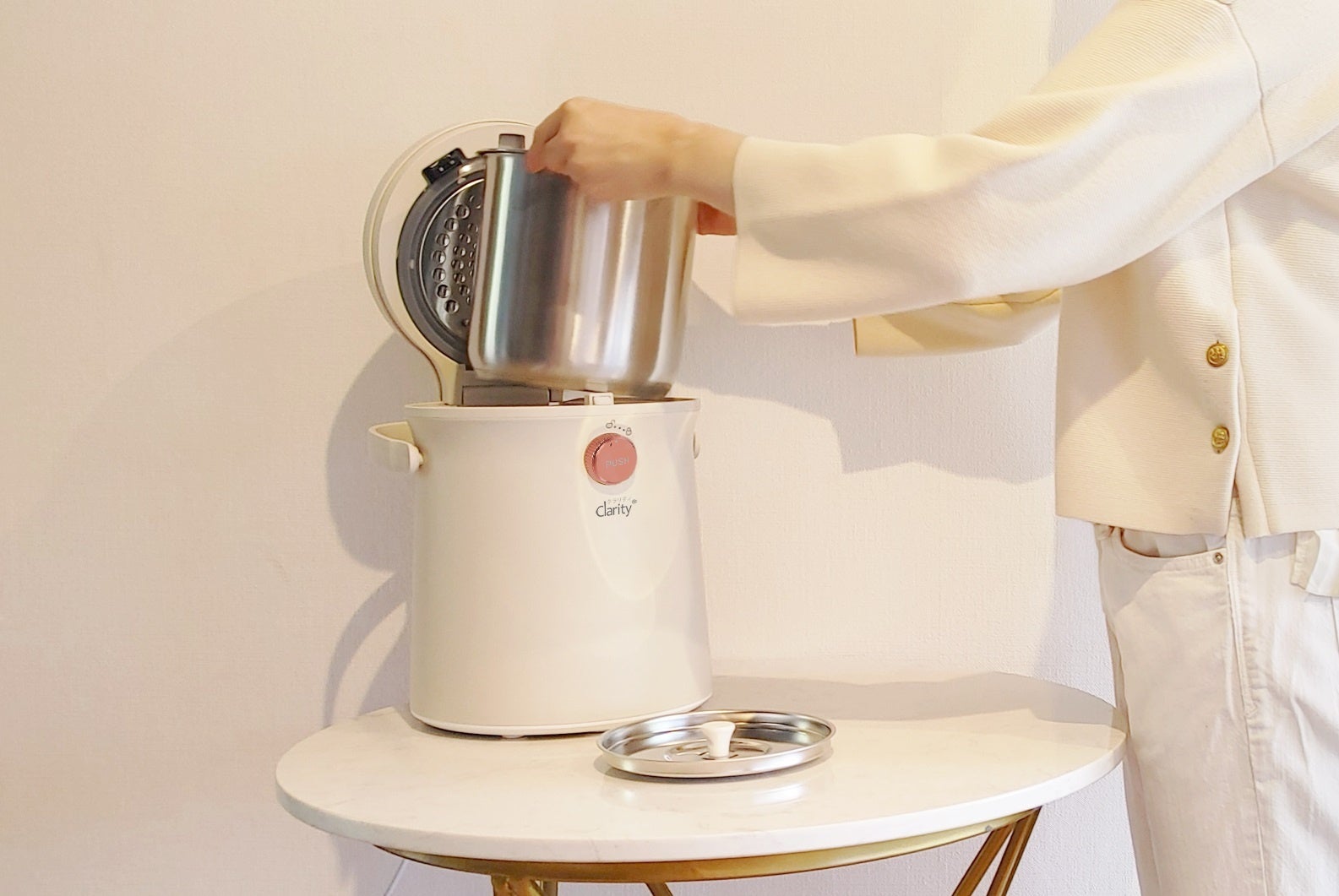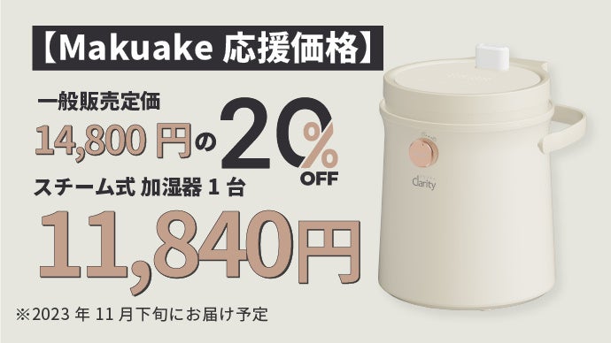 アタラシイものや体験の応援購入サービス Makuakeにて、プロジェクト進行中のスチーム式加湿器、クラリティ クリーンポット(h2338IV)。