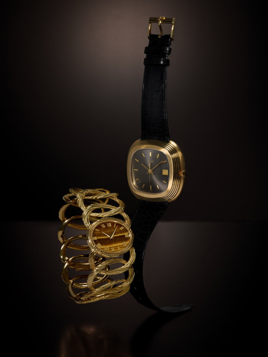 その中には、ピアジェのクリエイティブ ディレクター、ジャン・クロード・ゲイトがデザインし、1972年から1977年にかけて限定生産された、45mmのアイコニックなモデル15102のブラックとゴールドモデルが含まれていました。このウォッチは後に「ブラックタイ」と改名され、2014年のピアジェ140周年を記念して新たなデザインに生まれ変わりました。以前からこのウォッチと アンディ・ウォーホルとの関連性が語られてきましたが、2024年秋、スイスのメゾンがアンディ・ウォーホル美術財団と初めて提携を結んだことで、それが正式に認められました。