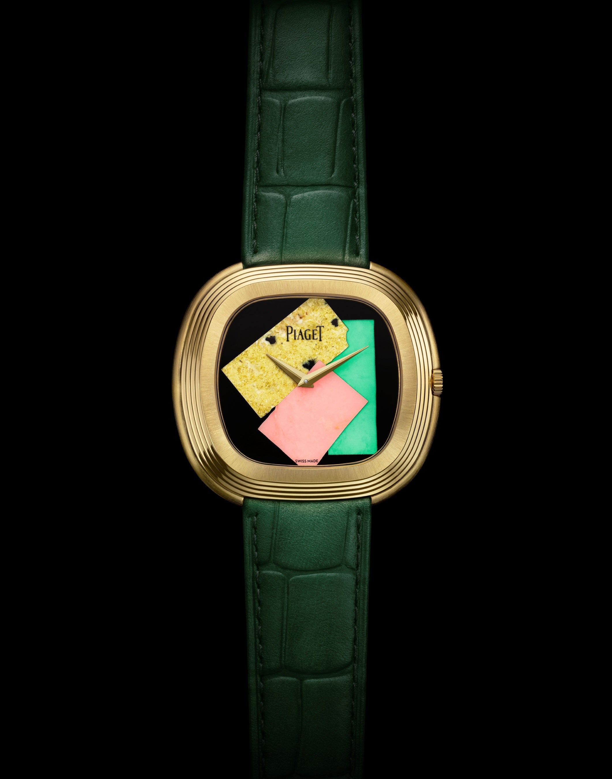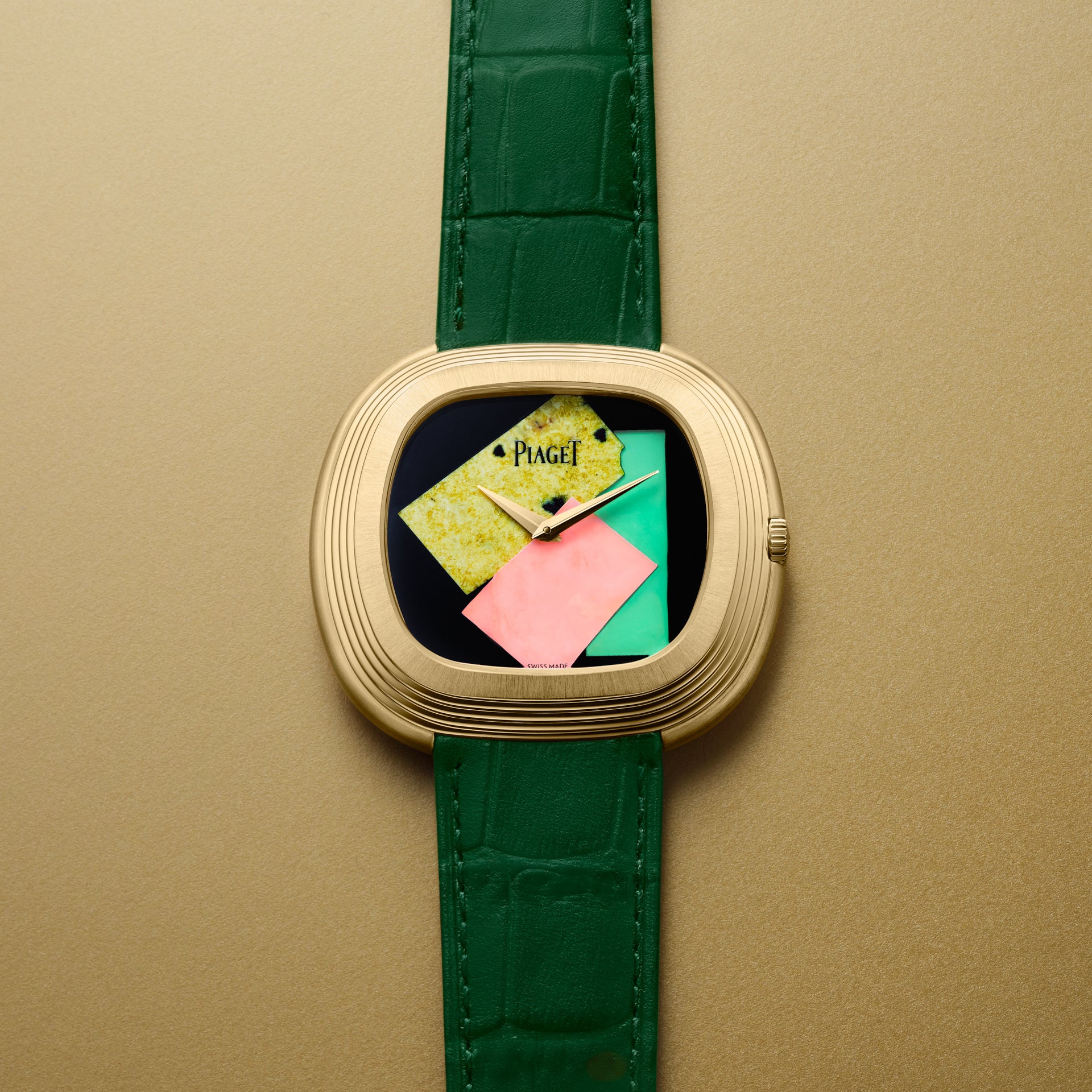 アンディ・ウォーホル ウォッチ「コラージュ」リミテッドエディションの文字盤のモチーフは、古くから伝わるメティエ・ダールのマルケトリ技法により、4種類のオーナメンタルストーンを丁寧に成形、カット、配置して製作されます。ベースには、1973年にウォーホル自身が所有していたウォッチと同様に、ブラックオニキスが使用されています。その上に、ナミビア産のイエローサーペンティン、ピンクオパール、グリーンクリソプレーズを薄くスライスしたものが組み合わされています。これらが、段差のある45mmの18Kイエローゴールド製ケースに収められ、深みのある落ち着いた色合いのグリーンレザーストラップが文字盤の美しさを引き立てながら、調和のとれたカラーパレットを完成させます。アンディ・ウォーホル ウォッチ「コラージュ」リミテッドエディションの18Kイエローゴールド製ケースバックには、縦方向のサテン仕上げが施されています。ウォッチ内部には501P1自社製自動巻ムーブメントを搭載。このスリムなムーブメントは、40時間のパワーリザーブを誇り、サーキュラーパターンのコート・ド・ジュネーブ装飾が施されています。ケースバックには文字盤デザインのベースとなったアンディ・ウォーホルの自画像がエングレービングされ、ピアジェのロゴとウォーホルのサインが刻まれています。まさにコレクター垂涎の逸品です。