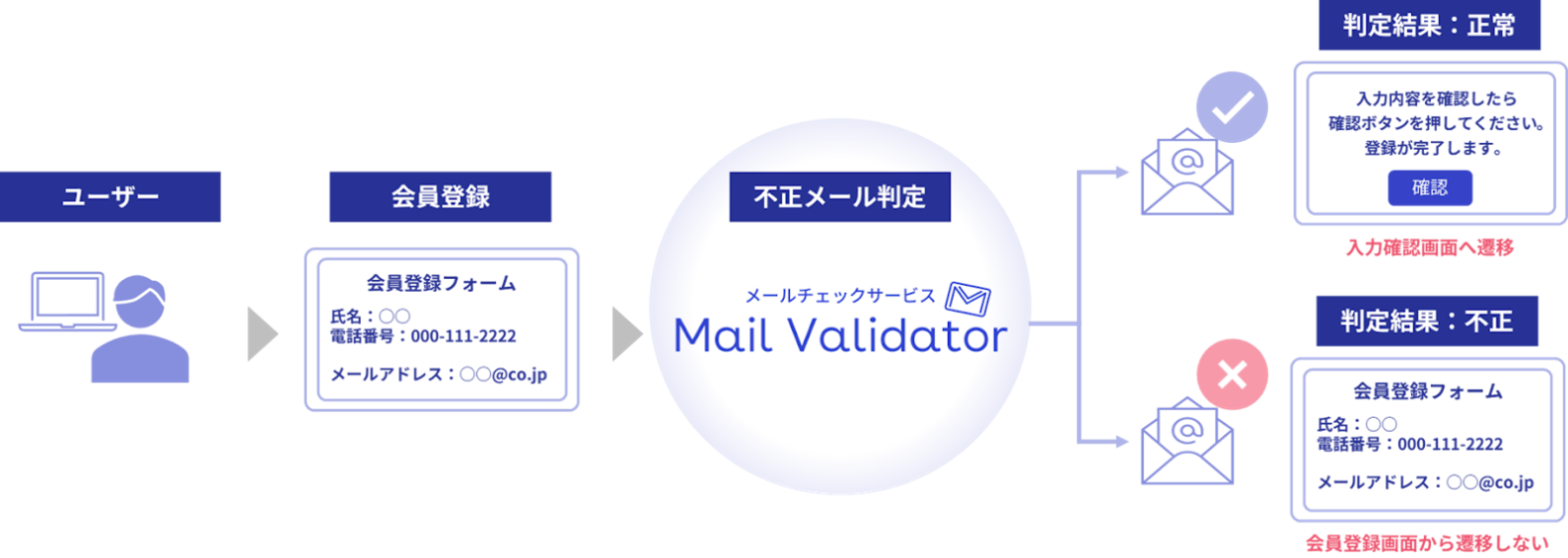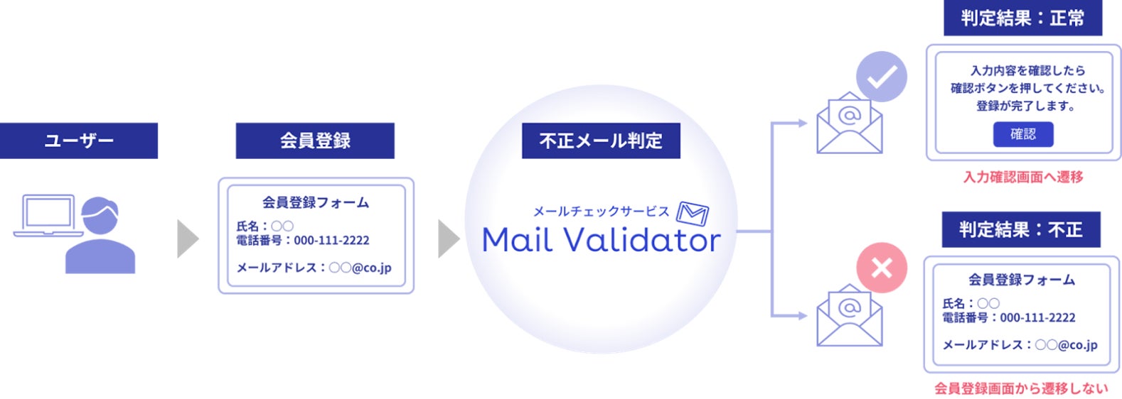 単なる形式チェックに留まらず、日々生成される使い捨てメールアドレスの特定や、実在性の高さを確認する判定ロジックを組み合わせることで、高精度な判定を実現しています。この技術力こそが、機密性の高い情報を扱う金融機関や、大規模な会員基盤を持つ通信・不動産業界において、選ばれている理由です。