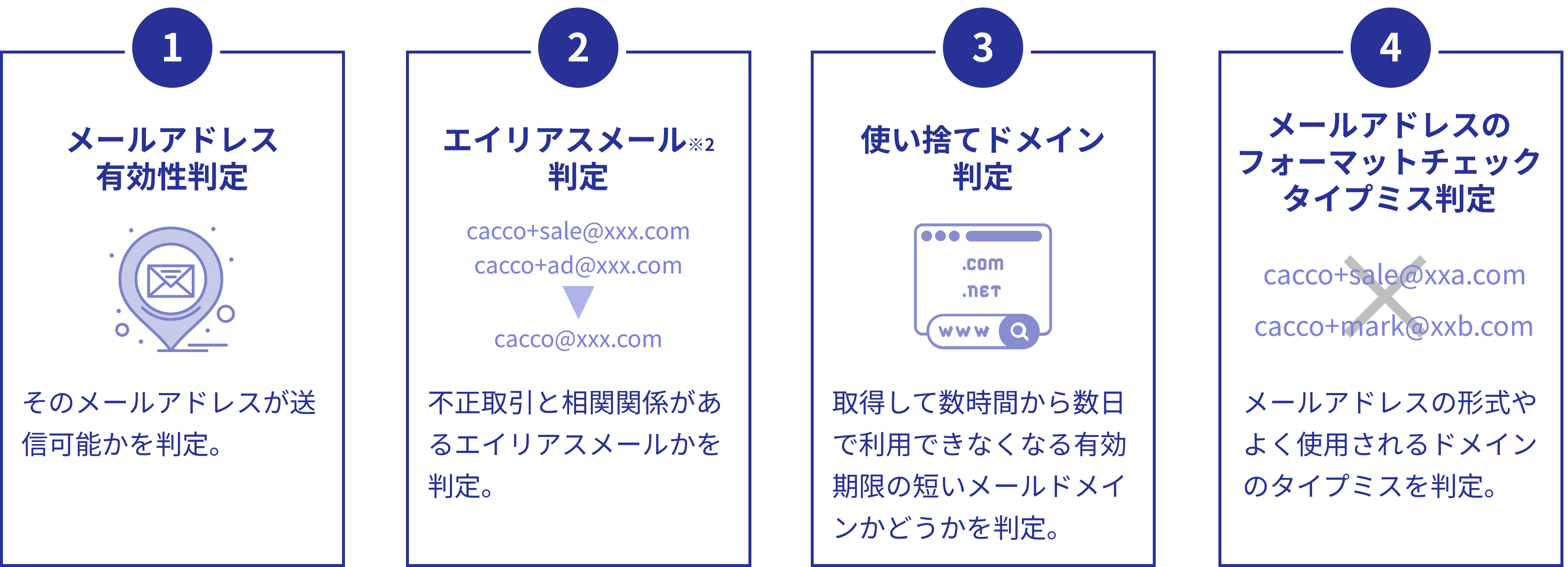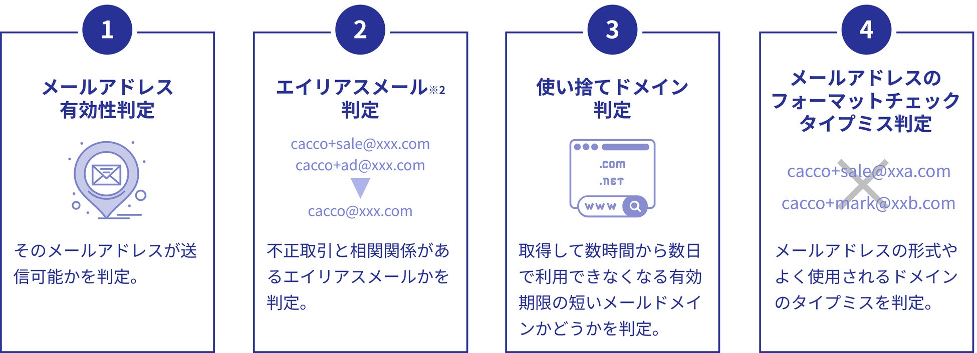 4つのチェック機能により、メールアドレスの有効性を多角的に判定します。