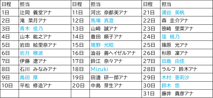 ▽出演日程表(出演日程は変更になる場合があります。青文字はトルチャインストラクターです。)