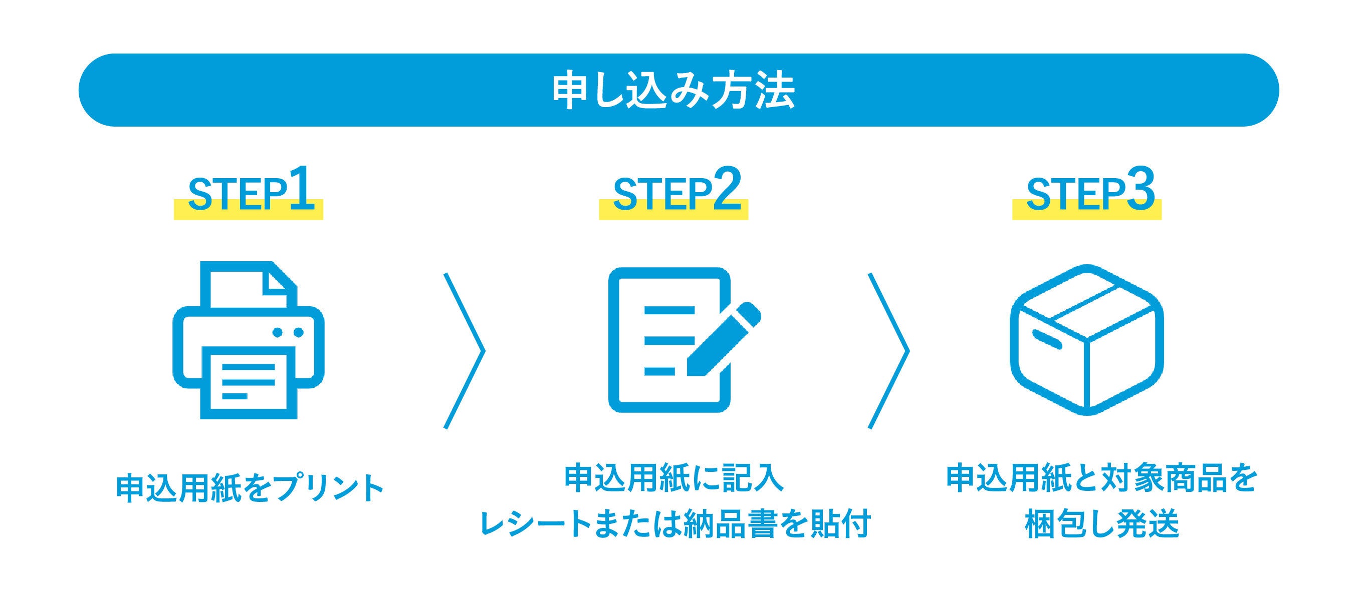 STEP3 STEP2で準備した申込用紙と対象商品を梱包し、受付期間内にキャンペーン事務局宛にヤマト運輸株式会社の「宅急便」にて着払いでお送りください。キャンペーン事務局より購入代金分のAmazonギフト券をご記入いただいたEメールアドレスにお送りします。
