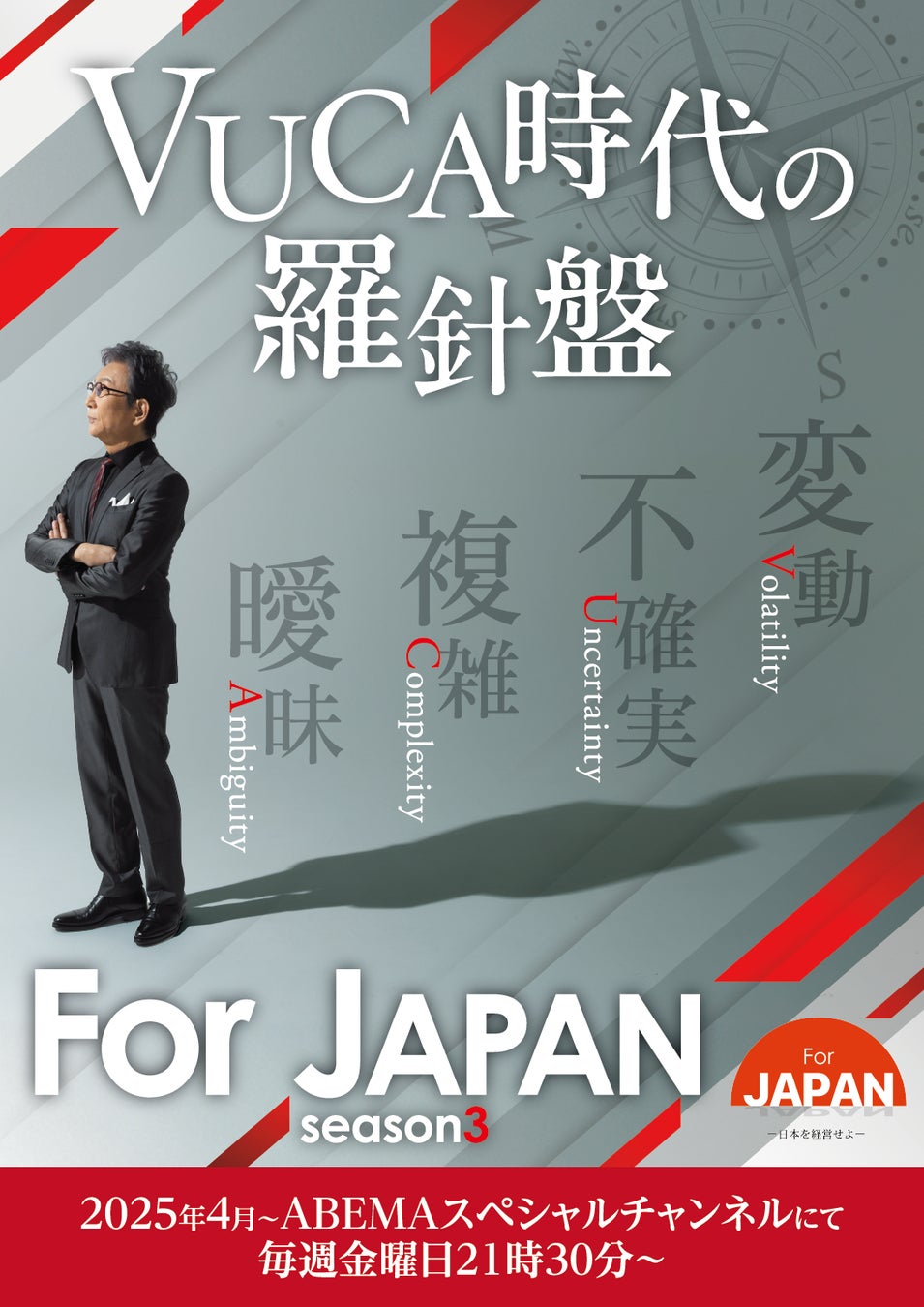プロジェクトの核である番組「For JAPAN」は、メインMCを古舘󠄁伊知郎氏、アシスタントMCを平井理央氏が務める経済バラエティです。月替わりのコメンテーターを招き、登壇する約10~16名の経営者とともに、日本のニュースや時事問題を経営者の視点から議論する構成で、2025年4月からABEMAにてシーズン3を放送しています。
