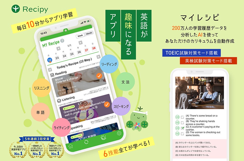 ・6技能全てを網羅した英語学習アプリ「レシピー」を利用した総合的な英語力の向上・AIにより、学習履歴や他学習者の成果の出た学習プロセスを分析し、一人一人に合わた日々の学習カリキュラムを生成