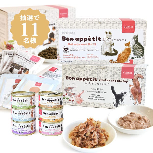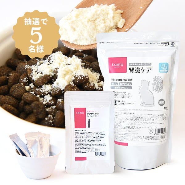 tamaオリジナル商品をご堪能いただける、ドライフードとウェットフード、口腔ケアに役立つサプリメントや猫用食器洗剤のセット。総額「14,655円相当」の贅沢なセットです。