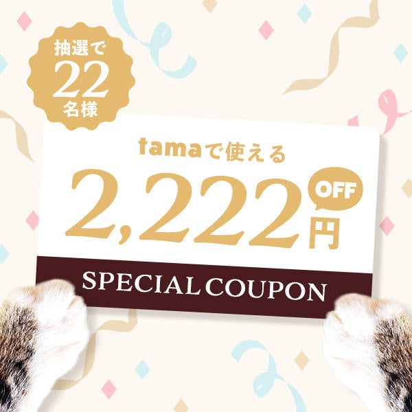 プレミアムキャットフード専門店・通販「たまのおねだり(tama)」サイト(https://www.tamaone.jp/)で使えるクーポン、2,222円分をプレゼントします。