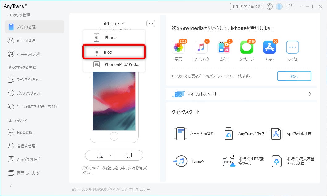 Step 1: iPodとiPhoneを共にパソコンに接続して、AnyTransを立ち上げます。iPodからiPhoneへ転送する場合、iPodを選択します。iPhoneからiPodを移行する場合、iPhoneを選択します。