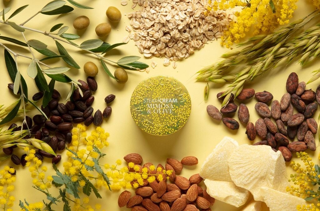 『スチームクリーム ミモザ&オリーブ』は、春先の肌悩み、繊細になりやすい心によりそうこだわりの原料を配合した季節限定の製品です。